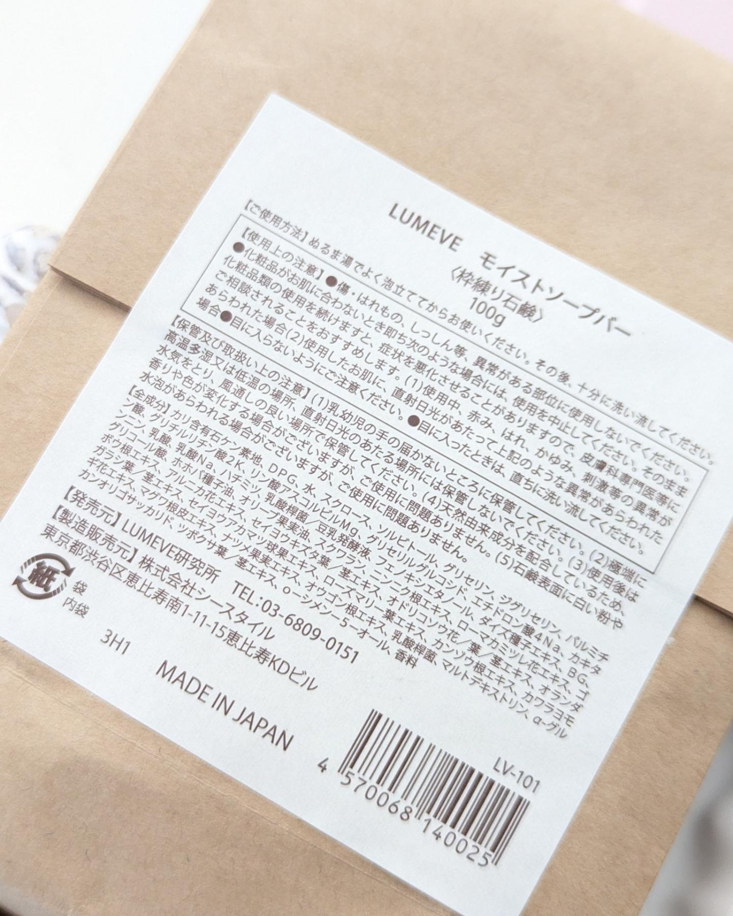 - カリ含有石ケン素地、DPG、水、スクロース、ソルビトール、グリセリン、ジグリセリン、パルミチン酸、グリチルリチン酸2K、リン酸アスコルビルMg、グリセリルグルコシド、エチドロン酸4Na、カキタンニン、乳酸、乳酸Na、ハチミツ、乳酸桿菌/豆乳発酵液、フェノキシエタノール、ダイズ種子エキス、BG、グリコール酸、ホホバ種子油、オリーブ果実油、スクワラン、ニンニク根エキス、ローマカミツレ花エキス、ゴボウ根エキス、アルニカ花エキス、セイヨウキズタ葉/茎エキス、オドリコソウ花/葉/茎エキス、オランダガラシ葉/茎エキス、セイヨウアカマツ球果エキス、ローズマリー葉エキス、カンゾウ根エキス、カワラヨモギ花エキス、マグワ根皮エキス、ナツメ果実エキス、オウゴン根エキス、乳酸桿菌、マルトデキストリン、α-グルカンオリゴサッカリド、ツボクサ葉/茎エキス、o-シメン-5-オール、香料