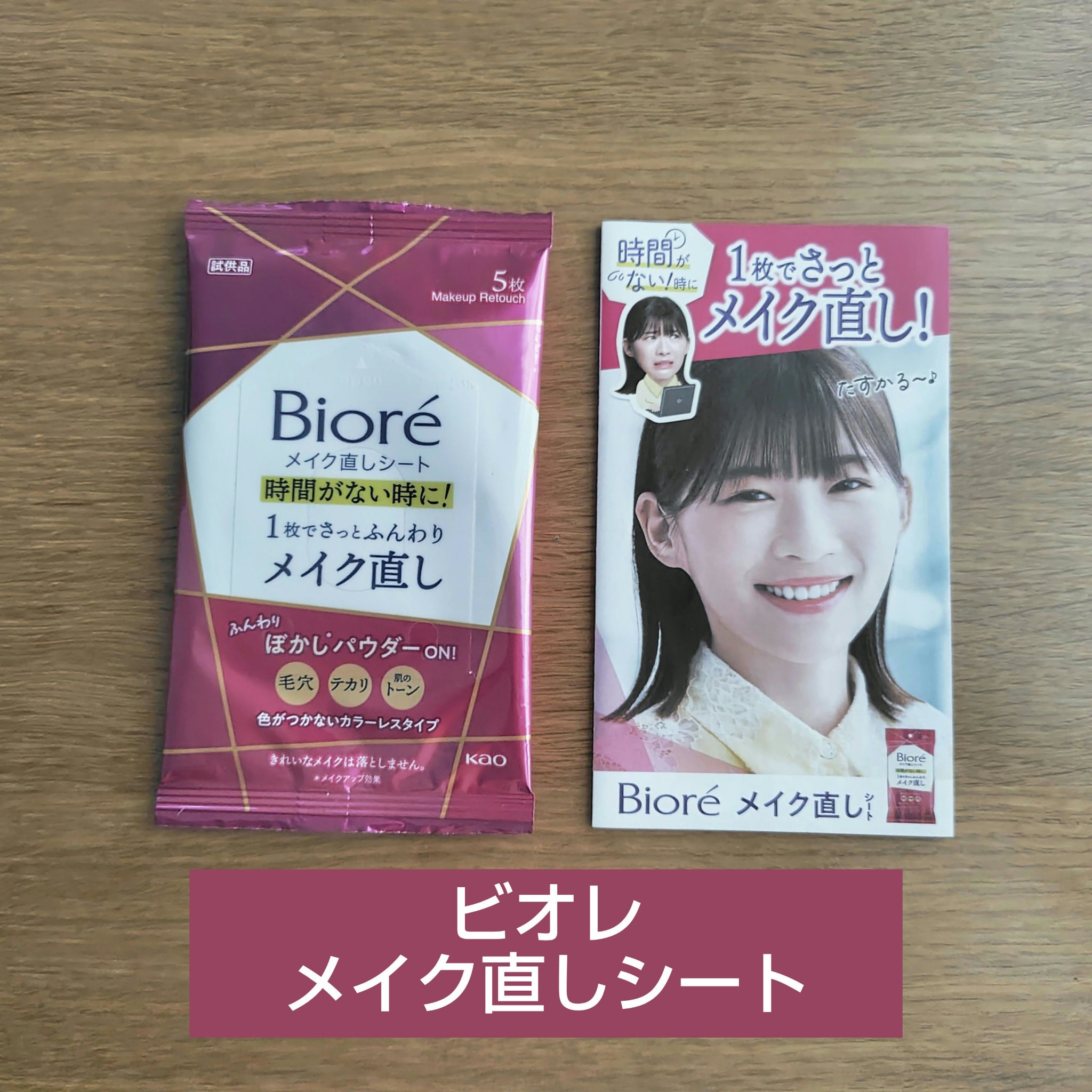 - <ビオレ メイク直しシート> 水、シリカ、エタノール、BG、酸化チタン、(アクリレーツ/アクリル酸アルキル(C10-30))クロスポリマー、PEG-60水添ヒマシ油、ラウレス-6、EDTA-2Na、水酸化K、フェノキシエタノール、メチルパラベン、エチルパラベン