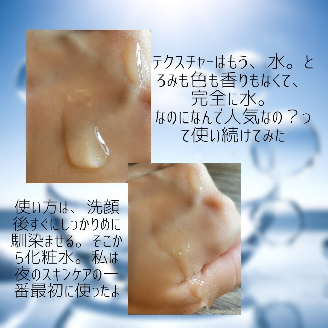 しゃばしゃばしていてサッパリした使い心地。肌に馴染みやすく、塗った後はサラッとします。 これをつけると次に使う化粧水がいつもより馴染みやすいように感じました。 サラッとしているから、夏でも使いやすそう🫶