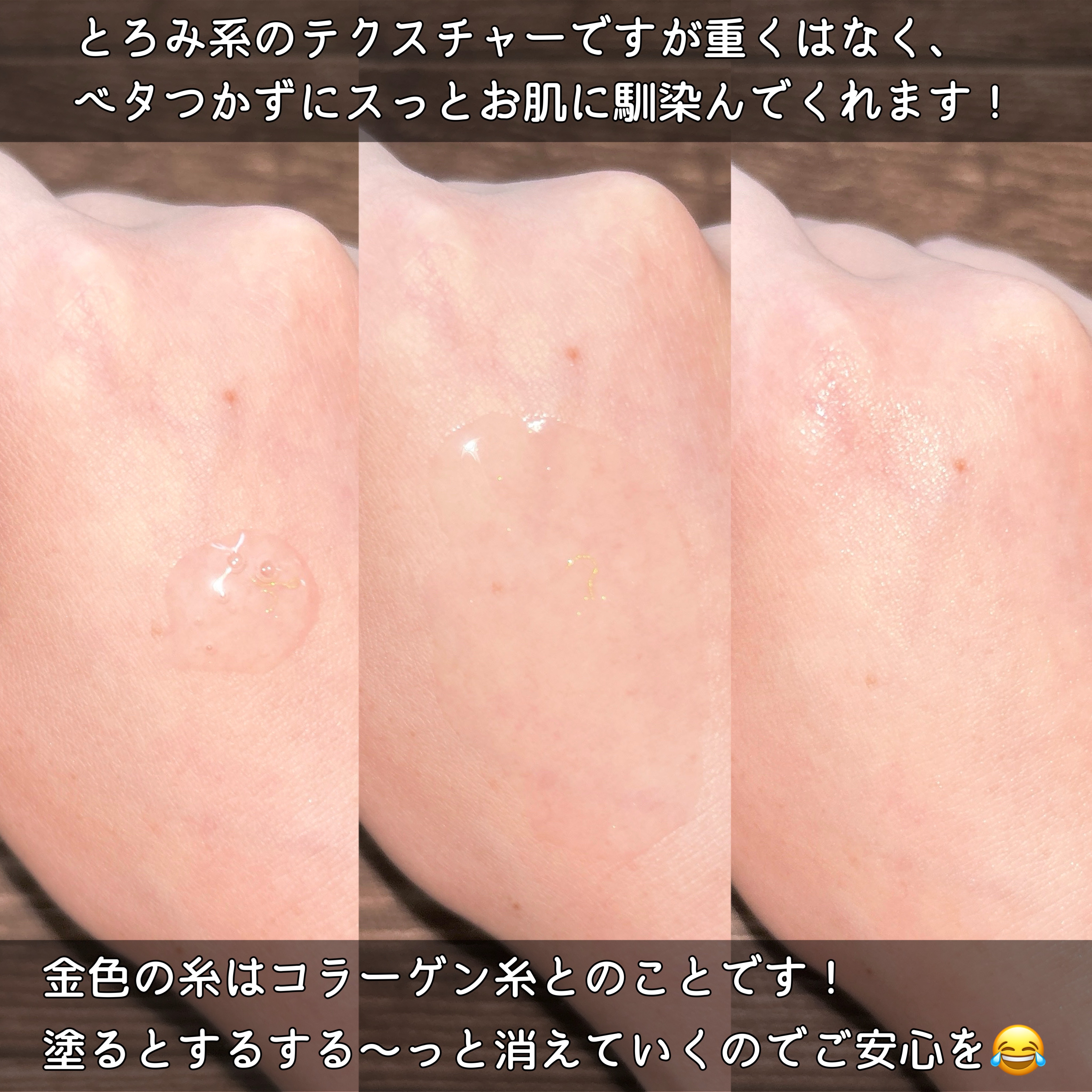 - <35mL> 水、BG、グリセリン、メチルプロパンジオール、1,2-ヘキサンジオール、ナイアシンアミド、カルボマー、トロメタン、PPG-13デシルテトラデセス-24、ヒドロキシエチルセルロース、シルクエキス、アデノシン、トチャカ、カンテン、エチルヘキシルグリセリン、EDTA-2Na、(アクリルレート/アクリル酸アルキル(C10-30))クロスポリマー、合成フルオトフロゴバイト、ベタイン、パンテノール、加水分解エラスチン、酸化チタン、赤色酸化鉄、マイカ、ジェランガム、加水分解コラーゲンエキス、ツボクサエキス、プロパンジオール、リン酸アスコルビルMg、ドクダミエキス、レシチン、アセチルグルタミン、フェノキシエタノール、カワラヨモギエキス、ヒアルロン酸Na、カプリリルグリコール、酸化スズ、金、スクワラン、水添ポリイソブテン、ベンジルグリコール、合成ヒト遺伝子組換オリゴペプチド-1、合成ヒト遺伝子組換ポリペプチド-1、合成ヒト遺伝子組換オリゴペプチド-2、合成ヒト遺伝子組換ポリペプチド-11、合成ヒト遺伝子組換オリゴペプチド-9、加水分解ムコ多糖、コラーゲン、トコフェロール、ヒアルロン酸クロスポリマーNa、加水分解ヒアルロン酸、合成ヒト遺伝子組換デカペプチド-7、合成ヒトオクタペプチド-4、合成ヒトペンタペプチド-19、ヒアルロン酸ヒドロキシプロピルトリモニウム、バルミトイルペンタペプチド-4、アセチルヘキサペプチド-8、トリペプチド-1、銅、ヒアルロン酸、ハナスゲ根エキス、アセチルヒアルロン酸Na、ラズベリーケトン