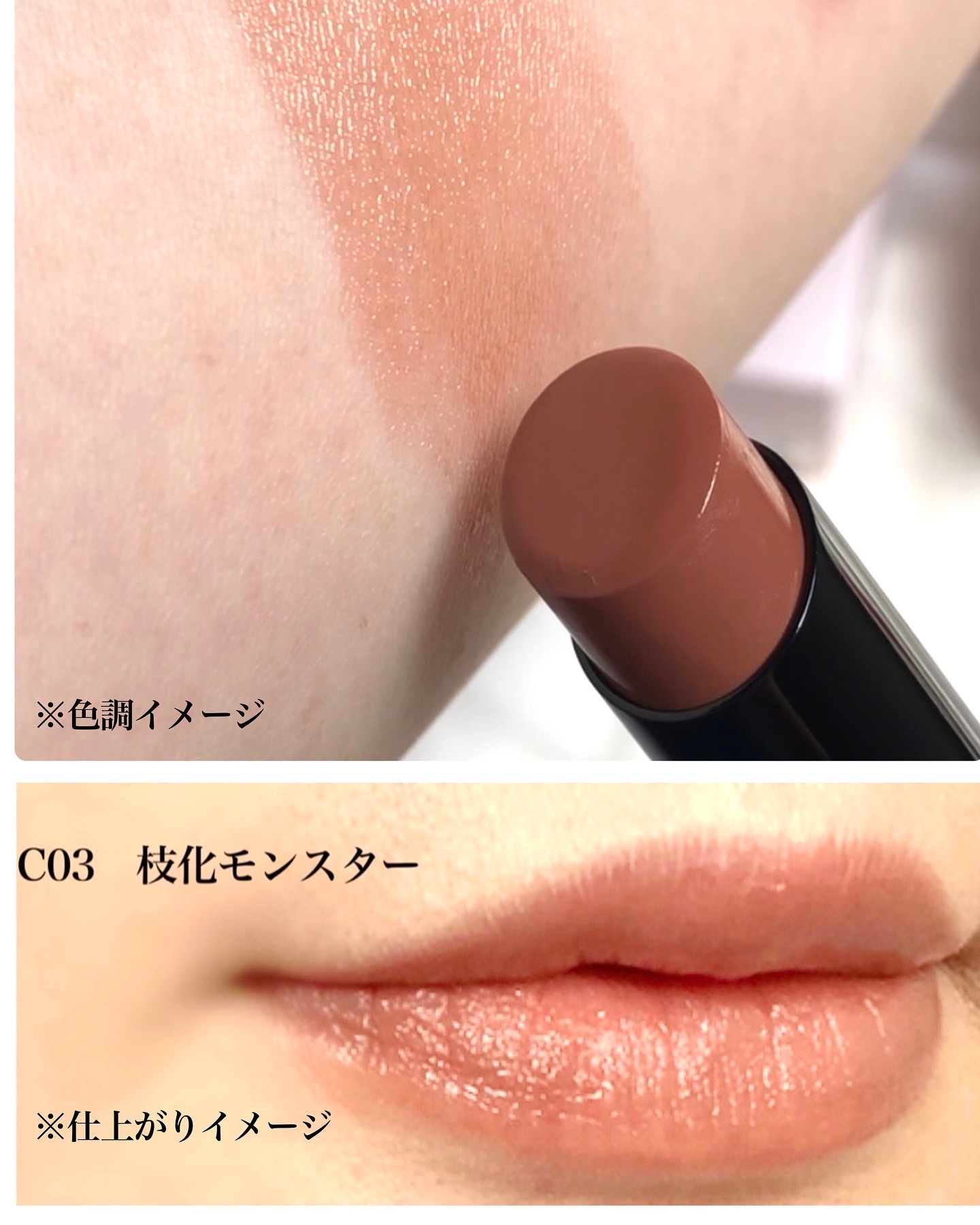 - <C01 炎化モンスター> テトライソステアリン酸ジペンタエリスリチル、オクチルドデカノール、トリ(カプリル酸/カプリン酸)グリセリル、イソノナン酸イソトリデシル、ラウロイルグルタミン酸ジ(フィトステリル/オクチルドデシル)、ビスアルキル(C16-18)グリセリルウンデシルジメチコン、パラフィン、水添ポリイソブテン、合成ワックス、ダイマージリノール酸(フィトステリル/イソステアリル/セチル/ステアリル/ベヘニル)、ラウロイルグルタミン酸ジ(オクチルドデシル/フィトステリル/ベヘニル)、マイクロクリスタリンワックス、水添マイクロクリスタリンワックス、トコフェロール、ホホバ種子油、オリーブ果実油、アーモンド油、ヒドロキシステアリン酸エチルヘキシル、(エチレン/プロピレン)コポリマー、ポリエチレン、(+/-)(チタン/酸化チタン)焼結物、マイカ、ラウロイルアスパラギン酸Na、ラウロイルリシン、塩化亜鉛、酸化鉄、硫酸Ba、トリイソステアリン酸イソプロピルチタン、赤202 <C02 肉色モンスター> テトライソステアリン酸ジペンタエリスリチル、オクチルドデカノール、トリ(カプリル酸/カプリン酸)グリセリル、イソノナン酸イソトリデシル、ラウロイルグルタミン酸ジ(フィトステリル/オクチルドデシル)、ビスアルキル(C16-18)グリセリルウンデシルジメチコン、パラフィン、水添ポリイソブテン、合成ワックス、ダイマージリノール酸(フィトステリル/イソステアリル/セチル/ステアリル/ベヘニル)、ラウロイルグルタミン酸ジ(オクチルドデシル/フィトステリル/ベヘニル)、マイクロクリスタリンワックス、水添マイクロクリスタリンワックス、トコフェロール、ホホバ種子油、オリーブ果実油、アーモンド油、ヒドロキシステアリン酸エチルヘキシル、(エチレン/プロピレン)コポリマー、ポリエチレン、ジメチコン、(+/-)(チタン/酸化チタン)焼結物、マイカ、ラウロイルアスパラギン酸Na、ラウロイルリシン、塩化亜鉛、酸化チタン、酸化鉄、水酸化Al、硫酸Ba、トリイソステアリン酸イソプロピルチタン、赤202 <C03 枝化モンスター> テトライソステアリン酸ジペンタエリスリチル、オクチルドデカノール、トリ(カプリル酸/カプリン酸)グリセリル、イソノナン酸イソトリデシル、ラウロイルグルタミン酸ジ(フィトステリル/オクチルドデシル)、ビスアルキル(C16-18)グリセリルウンデシルジメチコン、パラフィン、水添ポリイソブテン、合成ワックス、ダイマージリノール酸(フィトステリル/イソステアリル/セチル/ステアリル/ベヘニル)、ラウロイルグルタミン酸ジ(オクチルドデシル/フィトステリル/ベヘニル)、マイクロクリスタリンワックス、水添マイクロクリスタリンワックス、トコフェロール、ホホバ種子油、オリーブ果実油、アーモンド油、ヒドロキシステアリン酸エチルヘキシル、(エチレン/プロピレン)コポリマー、ポリエチレン、ジメチコン、(+/-)(チタン/酸化チタン)焼結物、マイカ、ラウロイルアスパラギン酸Na、ラウロイルリシン、塩化亜鉛、酸化チタン、酸化鉄、水酸化Al、硫酸Ba、トリイソステアリン酸イソプロピルチタン、赤202