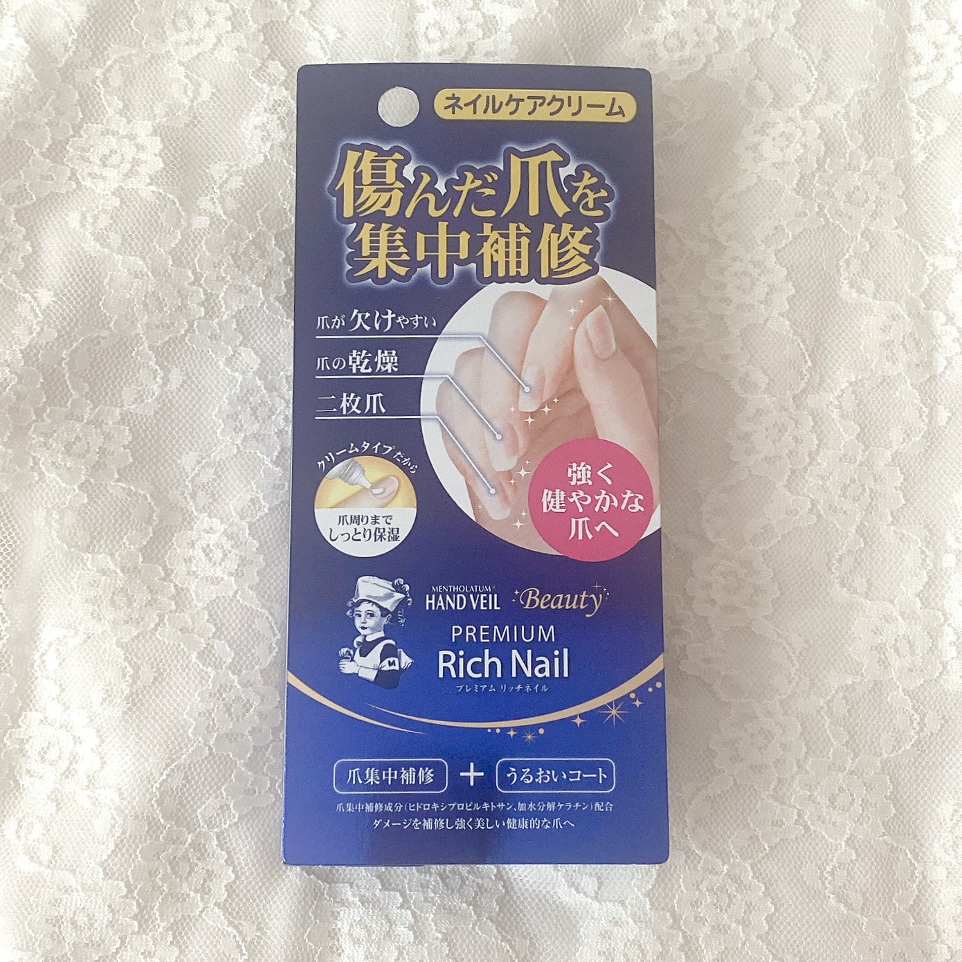 - 「メンソレータム ハンドベール ビューティー プレミアムリッチネイル」は、爪を保護し、すこやかに保つ爪集中補修クリームです。爪が欠けやすい人や爪の乾燥が気になる人、二枚爪の人などにおすすめです。ジェルネイルや研磨によりダメージを受けた爪表面を補修し、除光液や洗剤などにより乾燥した爪周りを保湿。強く美しい健康的な爪へ導きます。