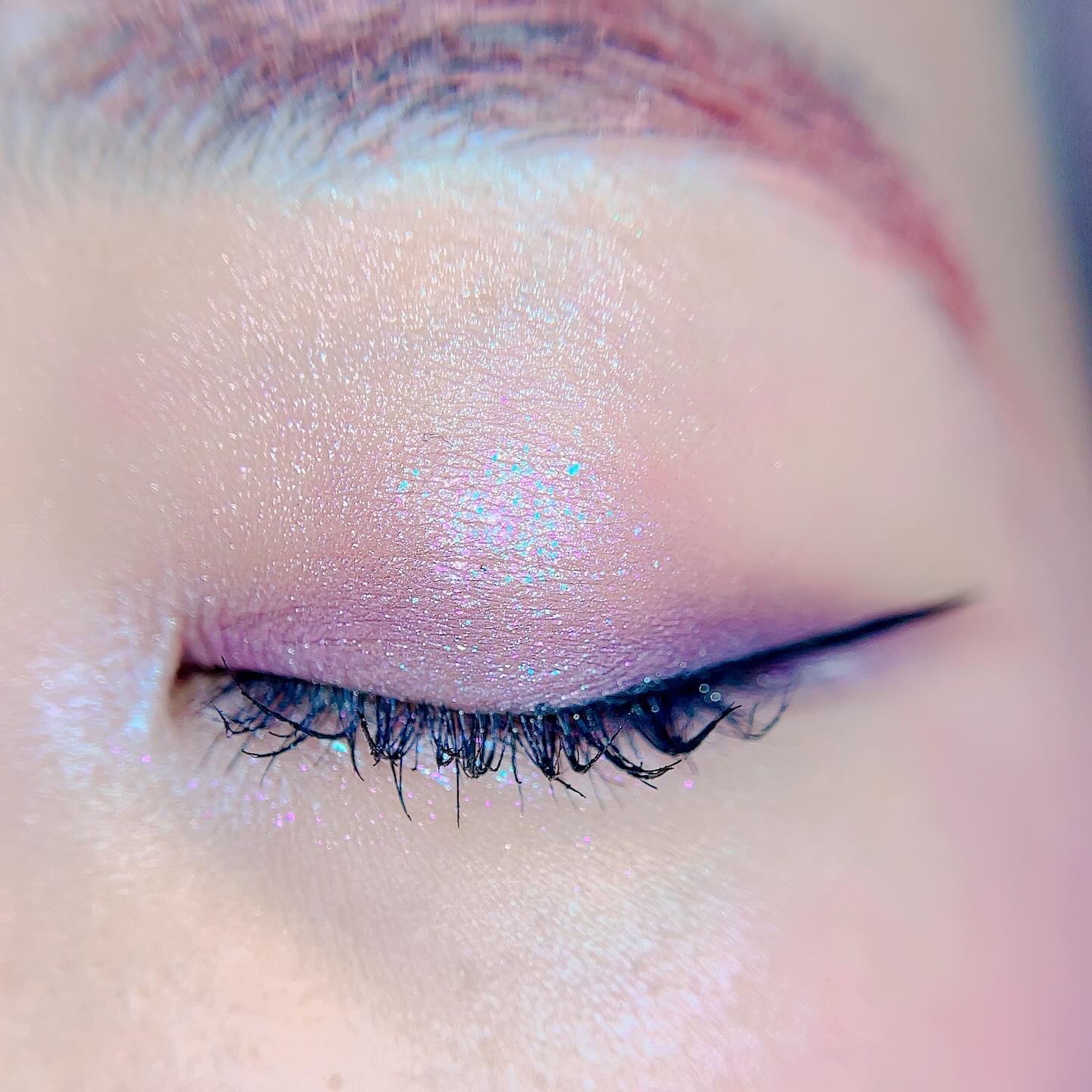ベースに右上、目頭から黒目上に真ん中、黒目〜目尻に右下を、左上を目頭にくの字に塗ってもらいました✨ ピンクサクラよりもクールな感じで、目で見た色より私の肌では紫っぽく発色しました😍 上2つはラメはぎっしりでときめく💓 ブラウンメイクがとても苦手だけれどこれならブラウンメイク出来そう👌(かなり紫寄りですが) くすみ感は強いので苦手な方は厳しいかも…(特に真ん中) クールな印象になるので大人顔さん向けor大人顔になりたい方向けのイメージです✨