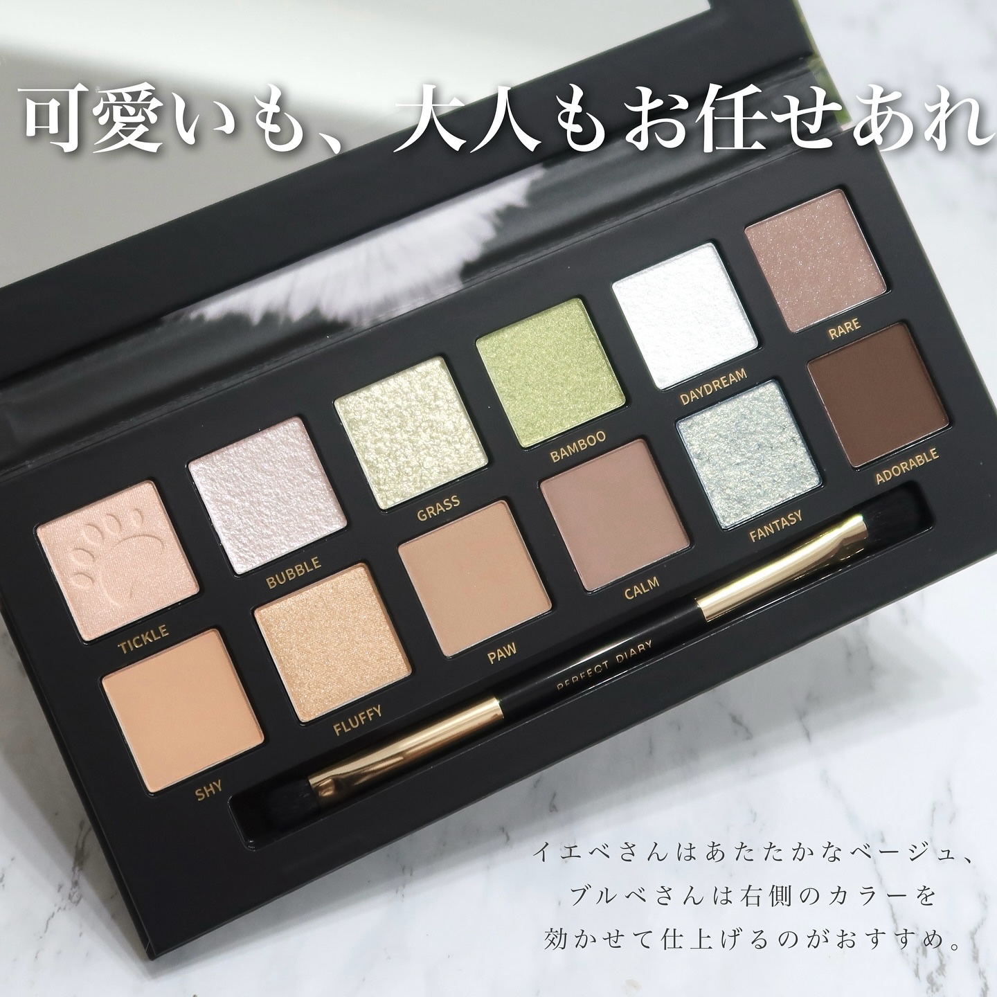 - #1.「中国で話題になったシリーズ」 #2.「4種類粉感」 滑らかマット、キラキララメ、モチモチベース状、ラメがついているマット色、多彩なカラーの組み合わせ、きめ細かい質感、肌に高密着で長持ち。 <虎> 虎からインスピレーションを受けたアニマルアイシャドウパレット。力強く活発なオレンジ・ゴールドをメインに、滑らかマット、キラキラグリッターなど多彩なテクスチャーとカラーの組合せで思い通りのメイクが完成。 <パンダ> ふんわりパンダのようなベージュ・ベビーピンクカラーや、パンダが住む竹林を表現したグリーンカラー。自由で愛らしいパンダからインスピレーションを受けたパレットで、かわいらしい印象も大人っぽい印象も1枚で叶える。 <猫> 猫からインスピレーションを受けたアニマルアイシャドウパレット。上品で落ち着いたブラウンとミステリアスなピンクパールがポイント。滑らかマット、キラキラグリッターなど多彩なテクスチャーとカラーの組合せで思い通りのメイクが完成。 <タンチョウ鶴> 鶴からインスピレーションを受けたアニマルアイシャドウパレット。使いやすいピンクベージュ系のカラーと鶴の頭をイメージした赤×白がインパクトを与える。滑らかマット、キラキラグリッターなど多彩なテクスチャーとカラーの組合せで思い通りのメイクが完成。 <赤狐> 赤狐からインスピレーションを受けたアニマルアイシャドウパレット。イエベ向きのオレンジブラウン系のカラーをメインに、滑らかマット、キラキラグリッターなど多彩なテクスチャーとカラーの組合せで思い通りのメイクが完成。狐のしっぽを再現したデザインもカワイイ。 <ラッキーラビット> うさぎからインスピレーションを受けたアニマルアイシャドウパレット。白うさぎのキュートさと透明感が再現できる赤・ピンク系の配色。滑らかマット、キラキラグリッターなど多彩なテクスチャーとカラーの組合せで思い通りのメイクが完成。 <虎&猫> 猫のしなやかさ、虎の眼光。一つのパレットで操る、二つの表情。 「猫と虎」にインスパイアされたデュアルアイメイク:「猫ルック」のしなやかな優しさ、「虎ルック」のクールな眼差し。気分に合わせて自由にスイッチ。 「ソフトブラウン × 繊細な煌めきで、優美なキャットアイを。」 「ディープスモーキー × シャープなラインで、力強いタイガーアイを。」 <オータムチェスナット> 秋の野を映し出す赤茶色と栗色のメイクで、秋冬ならではの温かみのあるカラースケールを演出。 ソフトマット、シマー、メタリックが交わり溶け合う、多彩な質感。濃厚さの中に軽やかさも。 単色でも、重ねても美しく。多様なスタイルを叶えます。