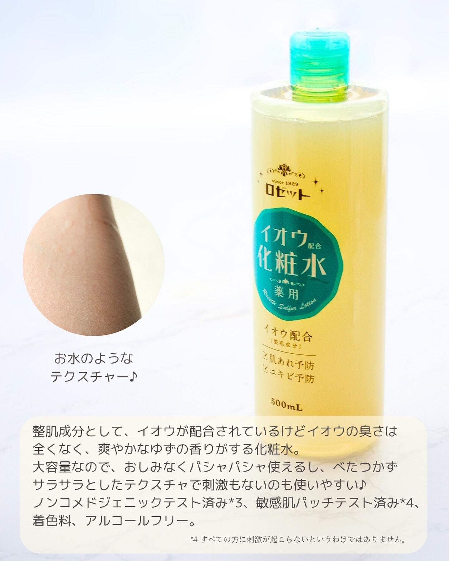 - 【医薬部外品】■薬用で肌あれ&ニキビ予防 有効成分グリチルリチン酸2K配合で、肌あれ・ニキビを防いで肌をすこやかに保ちます。 ●ノンコメドジェニックテスト済み*2 ●敏感肌パッチテスト済み*3 ●無着色料 ●アルコールフリー *2 すべての方にコメド( ニキビのもと) ができないというわけではありません。 *3 すべての方に刺激が起こらないというわけではありません。 ■イオウ*1+4種の美容成分*4配合で肌のコンディションをととのえる イオウ*1と4種の美容成分*4配合で、うるおいを守り、肌コンディションをととのえます。 ●肌のキメをととのえる「イオウ*1」 ●うるおいを守り、肌コンディションをととのえる4種の美容成分 「ツボクサエキス*4、アーティチョークエキス*4、湯原温泉水*4、ユズセラミド*4」 *1 整肌成分 *4 保湿成分 ■高浸透*5でさっぱりみずみずしい使用感 化粧水が素早くなじんですっと浸透*5。肌あれやニキビが気になる肌でも使いやすい、さっぱりした使用感でみずみずしい肌へ。 ●高浸透*5 ●さっぱりみずみずしい肌へ *5 角質層まで ■柚子ヒノキの香り さわやかで清涼な柚子ヒノキの香り。心落ち着くスキンケアタイムを。 ■大容量サイズで、使い方もいろいろ 顔・からだ全身に。バシャバシャたっぷり使える大容量(500mL)で、使い方もいろいろ。 コットンに含ませてふきとり化粧水やスペシャルケアとして、背中のニキビ予防などにも。 \鮮やかなカラーのボトルにも注目/ ボトルはイオウ(硫黄)をイメージしたやわらかなライトイエローに。アクセントカラーとしてイオウ(硫黄)泉やイオウ(硫黄)湖でみられるピーコックグリーンを配色し、鮮やかな色彩のデザインに仕上げました。