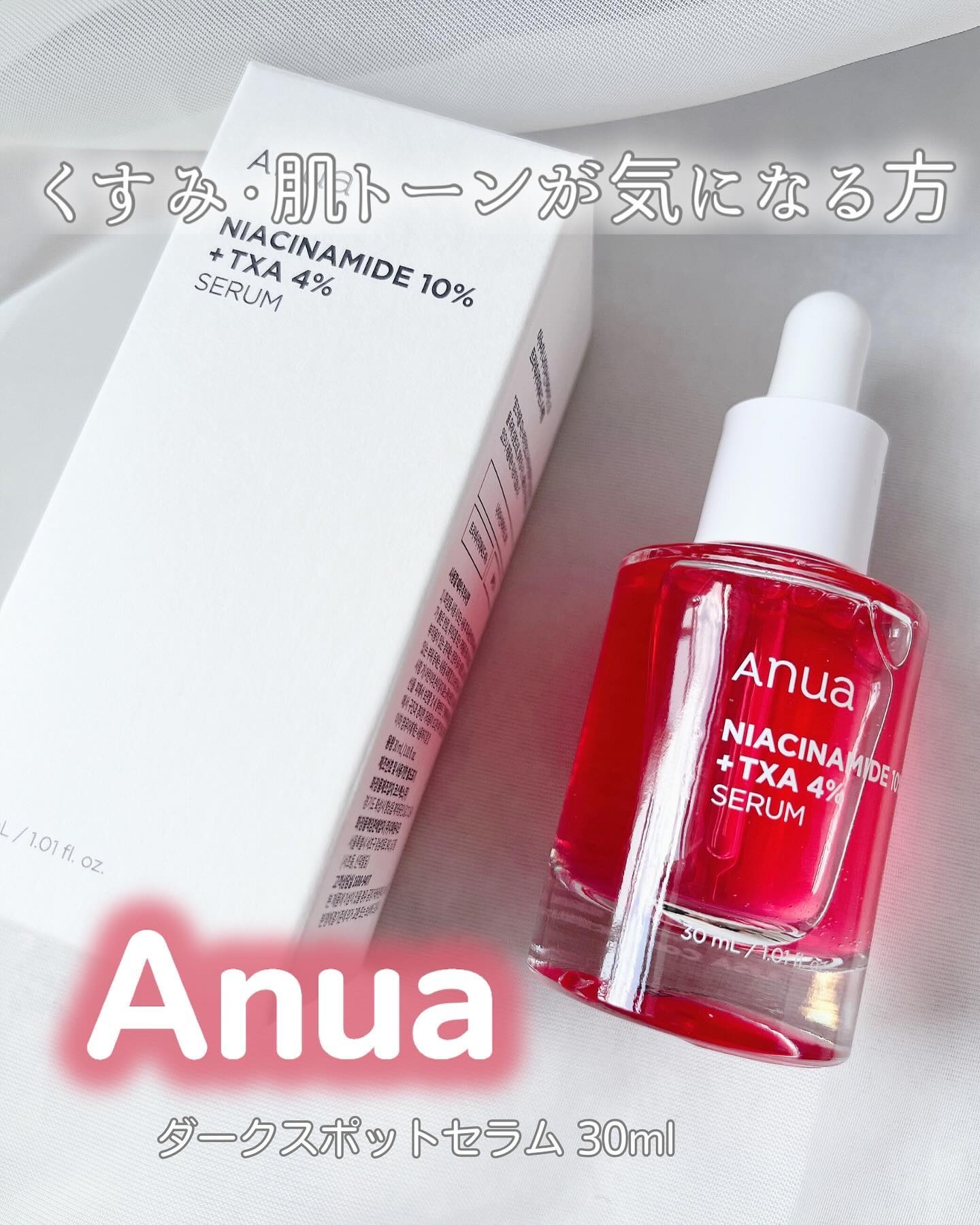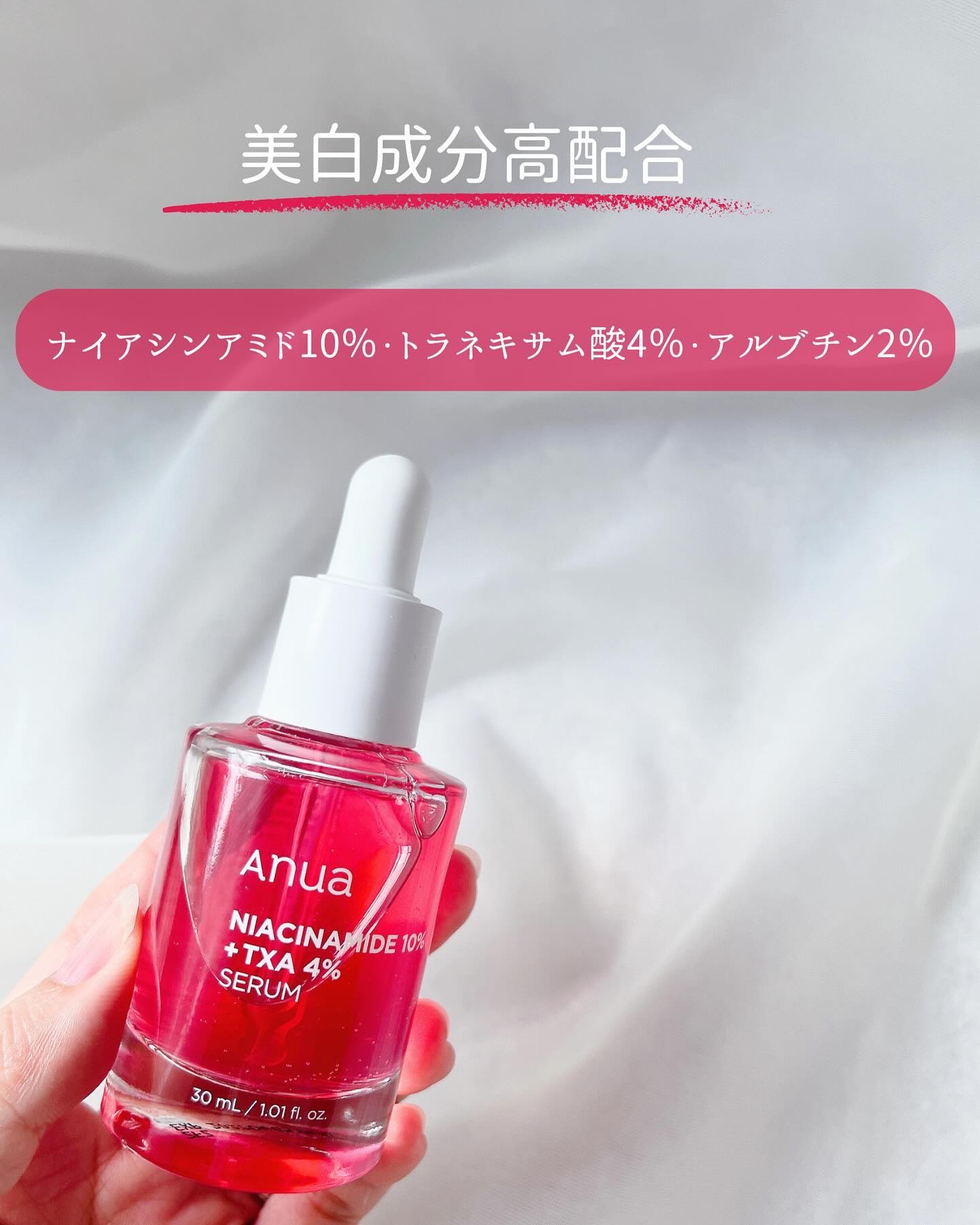 Anuaの真っ赤な美白* セラム🫶❤️ ▶︎ダークスポットセラム ♡ナイアシンアミド10% ♡トラネキサム酸4% ♡アルブチン2% と 美白* 成分が豪華に高配合💖 攻めの美白* 美容液なのに、朝夕関係なく肌への負担なく毎日誰でも使えるよ😉❣️