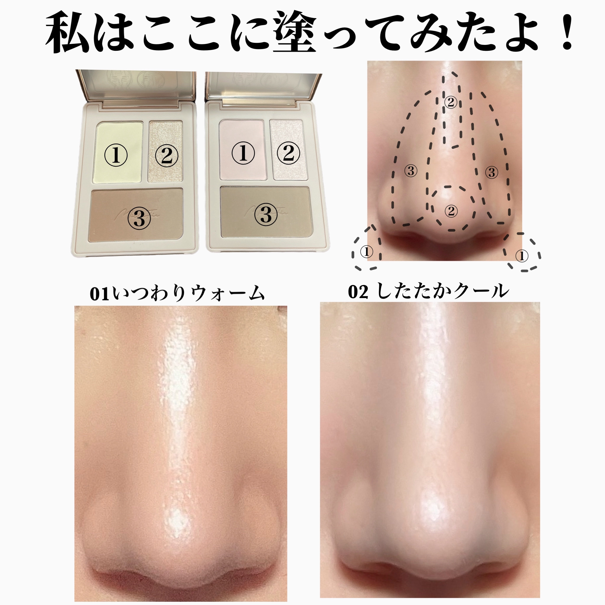 - マット質感でナチュラルボーンな輪郭演出!これぞ「#チート顔」 2色のハイライトが1つのパレットに入っており、用途によって使い分けが可能です。より高さを出したい、強調したいというところにはつやタイプのハイライトを、ナチュラルに輪郭補正したいところやテカリを抑えつつ肌に凹凸を出したいところにはマットハイライトを乗せる使い分けがおすすめです。 イエベ・ブルベ別のカラー展開 本製品は「01 いつわりウォーム」がイエベ向け、「02 したたかクール」がブルベ向けの2色展開となっております。ハイライトカラーもパーソナルカラーに基づいて調整された色味のため、自然で可愛い輪郭を演出します。 スマートなフォルムで持ち運びにも 3色も入って鏡付きなのに薄くスマートな設計のため、持ち運びに適しています。自宅でのメイクにも、出先でのメイク直しにも使える便利なアイテムです。 2024年6月17日よりQoo10、楽天市場店、Yahoo!ショッピングで販売を開始予定 店頭では7月上旬より全国のロフトおよびロフトネットストア、ハンズおよびハンズネット、アインズ&トルペ、@cosme STOREにて順次先行販売を開始予定(いずれも一部店舗を除く)