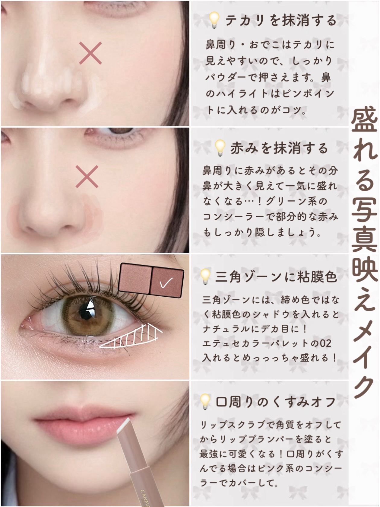 rom&nd ベターザンパレット 01PAMPAS GARDEN キャンメイク アイバッグコンシーラー 02ピンクベージュ CEZANNE ストレッチコンシーラー 30オレンジ系 これどんなに濃いクマも消える◎ やり方は画像を見てください🫶🏻 ラメを使わずに盛りたい時や、あざとく盛りたい時におすすめ!