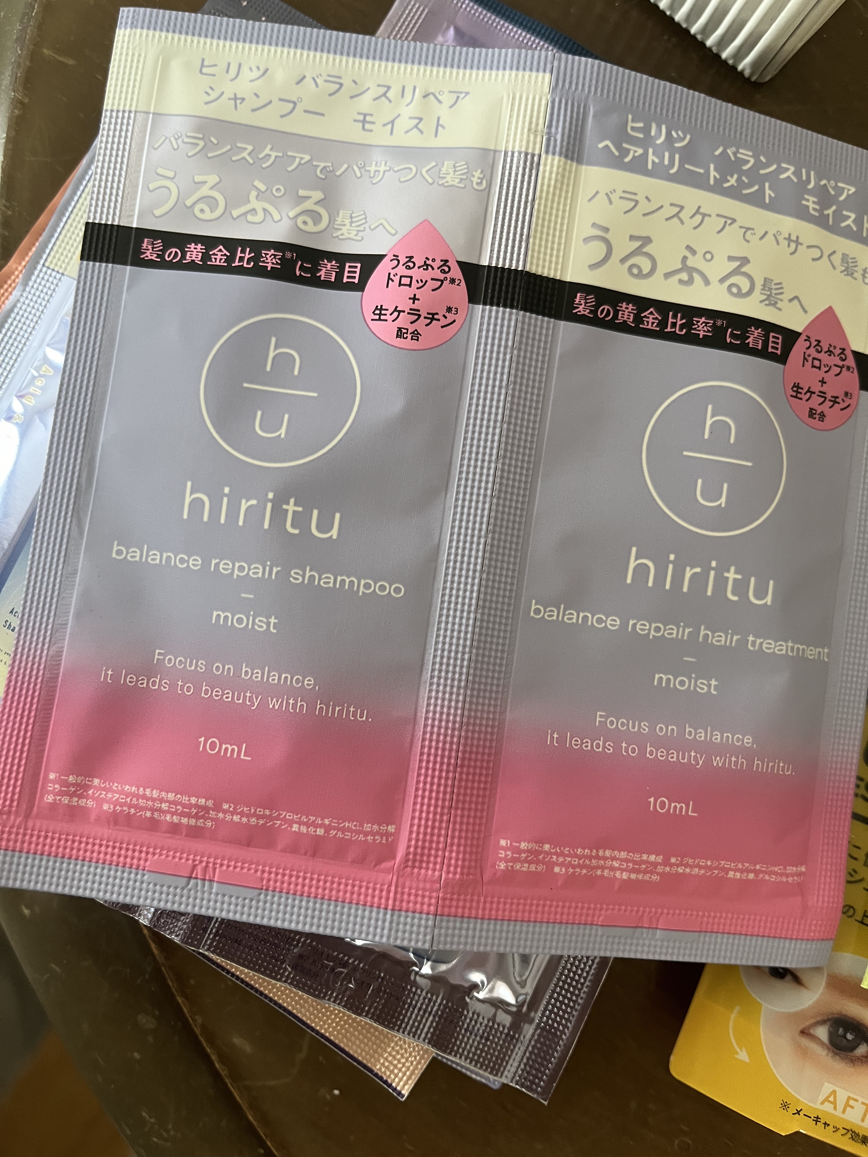 hirituヒリツ・バランスリペアヘアオイル スムース¥1,540・バランスリペアシャンプー/ヘアトリートメントモイスト¥121(しっとりとした仕上がり。パサつきや広がりやすい髪の毛に。ジャスミンとアプリコットを加えた香り。)・バランスリペア...