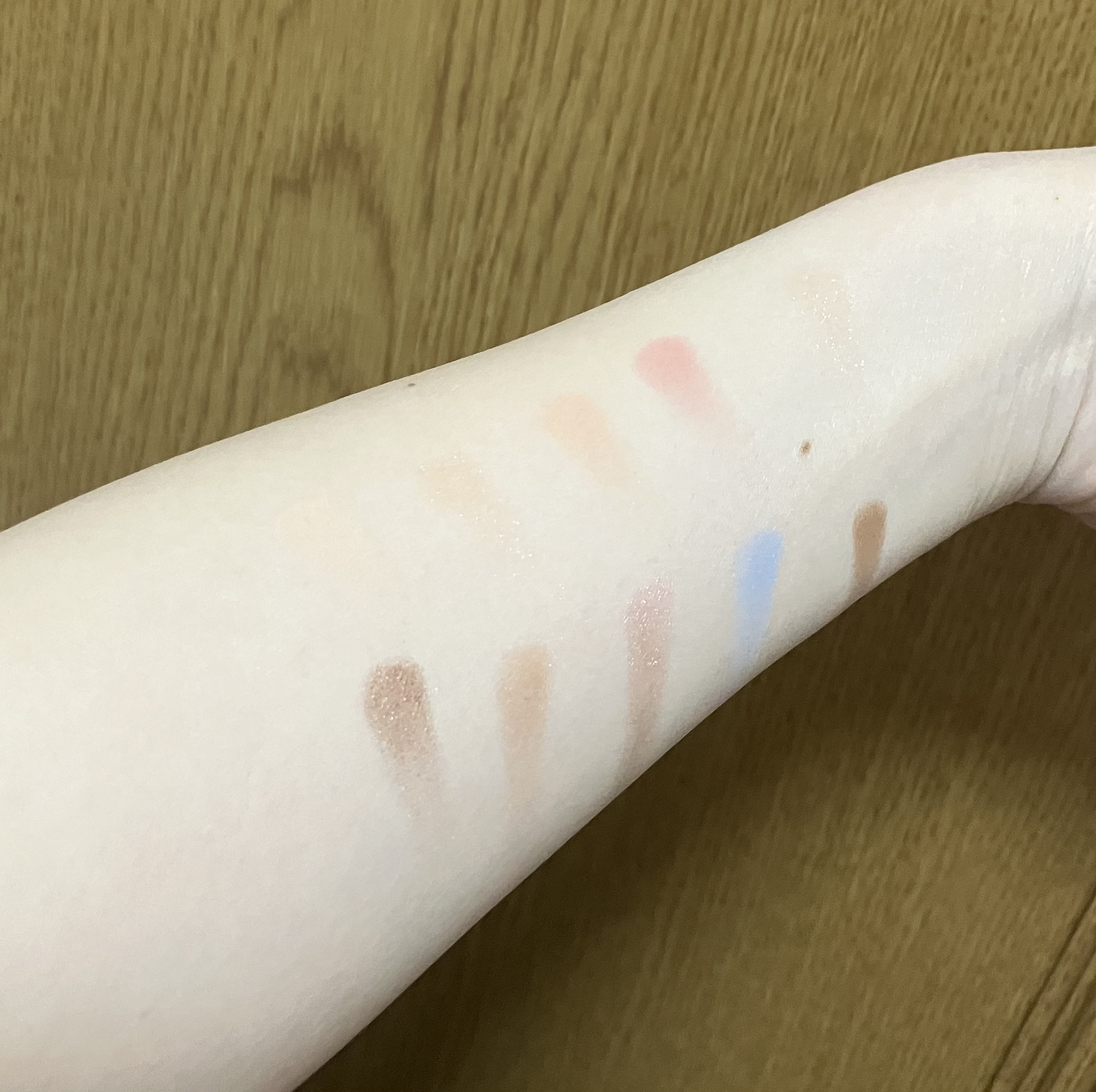 粉質はふわっとマットって感じで韓国コスメによくある?やつ 発色はバチバチの高発色まではいかないけど普通に良い カラーはブルベ夏の私にぴったりって感じで馴染みが良く使いやすい。ラメも入ってて大人しすぎなくて可愛い