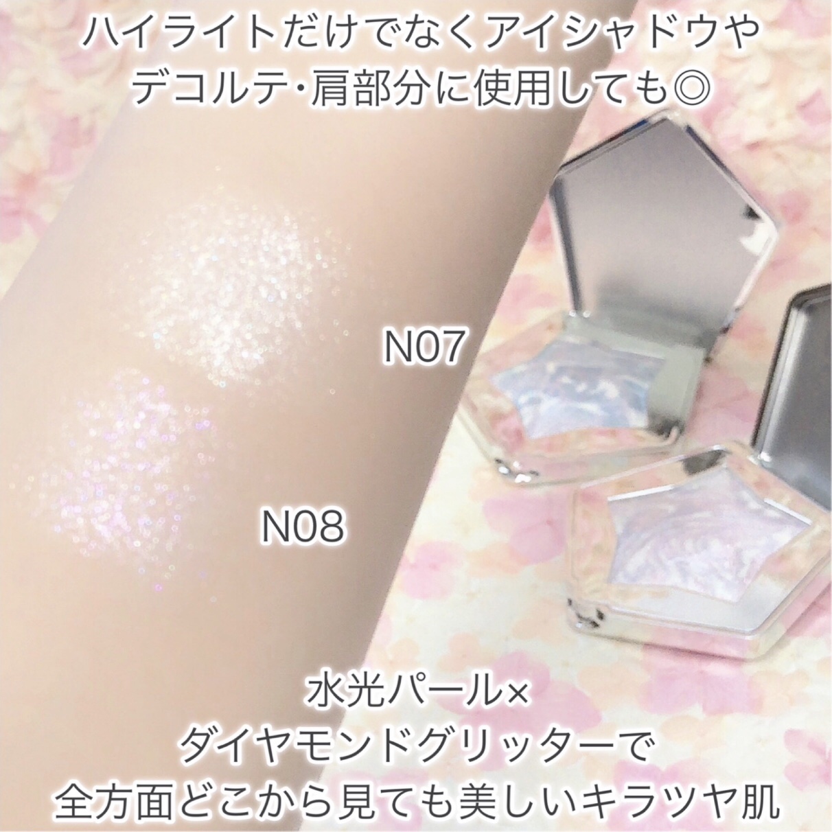 - 「ダイヤモンドのような輝き」天の川のように輝く、透明感と輝きに優れた真珠のような光沢。 複数のファインダイヤモンドの輝きを再現 <01 シルバーホワイト> シルバーホワイトのカラーが美しく輝いてツヤと透明感をプラス。なめらかでモチっとしたテクスチャーと小粒のラメが美しいツヤ肌を演出。Tゾーンや頬骨、デコルテなど光を与えたい部分に塗ればダイアモンドのように輝く。 <02 ライトシャンパン> ライトシャンパンのカラーが血色感と自然な光沢感をプラス。なめらかでモチっとしたテクスチャーと小粒のラメが美しいツヤ肌を演出。Tゾーンや頬骨、デコルテなど光を与えたい部分に塗ればダイアモンドのように輝く。 <03 シャンパンゴールド> シャンパンゴールドのカラーが表情を華やかに引き立てる。なめらかでモチっとしたテクスチャーと小粒のラメが美しいツヤ肌を演出。Tゾーンや頬骨、デコルテなど光を与えたい部分に塗ればダイアモンドのように輝く。 <05 シャンパンピンク> シャンパンピンクのカラーが血色感と透明感を与える。チークに重ねればピンクが引き立つ!なめらかでモチっとしたテクスチャーと小粒のラメが美しいツヤ肌を演出。Tゾーンや頬骨、デコルテなど光を与えたい部分に塗ればダイアモンドのように輝く。 <N01 シルバーホワイト> シルバーカラーのきらめきで、一瞬で透明感ある印象に。 小粒パール+大粒グリッターの組み合わせが、星屑のように繊細かつ大胆に煌めいてワンランク上のメイクに仕上げる。なめらか&モチっとした使用感で肌に高密着。 光を反射させる高屈折オイル配合でどの角度でもツヤ肌を実現。 鼻・頬・目頭・眉下以外にも、肩やデコルテに仕込めばお顔のツヤとリンクして、内から輝くような自然な印象に。 <N02 ライトシャンパン> ライトシャンパンのカラーが肌の色に自然になじみながら、ほどよいツヤと立体感をプラス。 小粒パール+大粒グリッターの組み合わせが、星屑のように繊細かつ大胆に煌めいてワンランク上のメイクに仕上げる。 なめらか&モチっとした使用感で肌に高密着。光を反射させる高屈折オイル配合でどの角度でもツヤ肌を実現。 鼻・頬・目頭・眉下以外にも、肩やデコルテに仕込めばお顔のツヤとリンクして、内から輝くような自然な印象に。 <N07 ネビュラブルー 日本限定色> ブルーとパープルの大粒ラメと、細かいシルバーラメが混ぜ合わさって色白な肌にツヤ感を与えてより明るく見せることができる! <N08 ネビュラパープル 日本限定色> パープルとピンク色の大粒ラメと、細かいシルバーラメが混ぜ合わさって、どのような肌色にもぴったり!かわいらしい雰囲気が作れる。