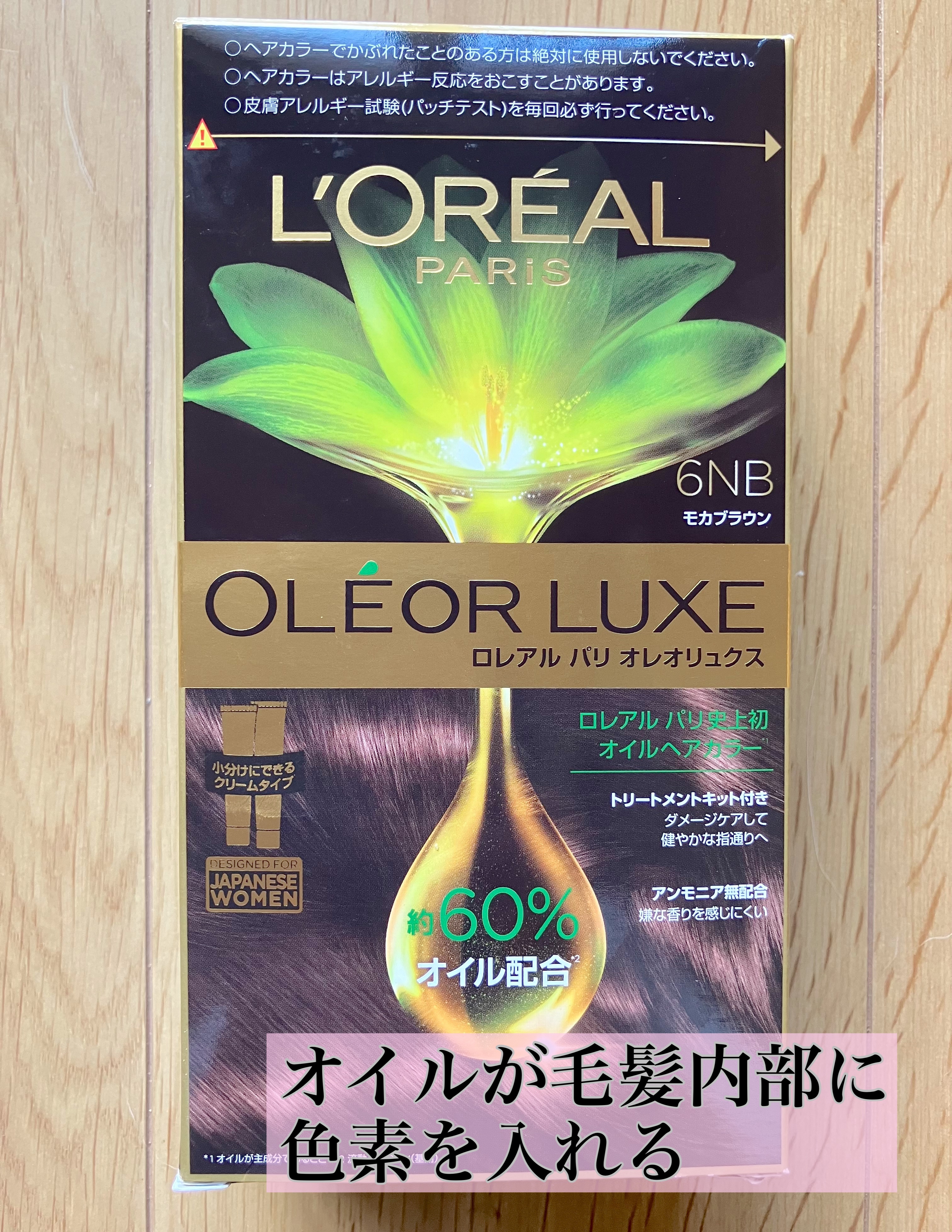 オイル約60%配合。髪・頭皮のダメージに着目した、オイルで染めるプレミアムオイルヘアカラー。発色と、光を放つような透明感。 カラー剤特有のツンとする気になるにおいを感じにくく、カラー中もカラー後も快適です。 トリートメントが2種類!!使用中の香りはツンとした香りはしなくてなんか不思議な香り!?