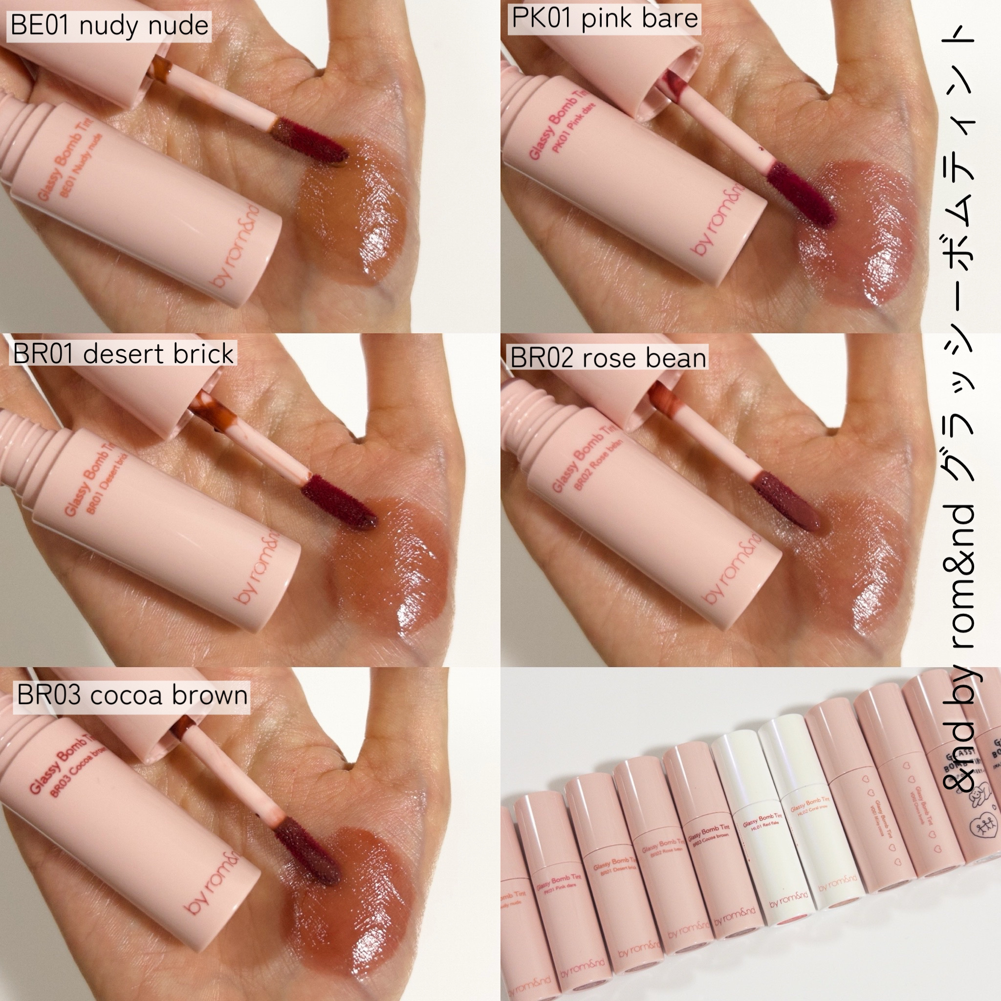 ローソン限定!ロムアンドコラボティント♡&ndbyrom&nd「アンドバイロムアンド グラッシーボムティント」 ¥820・BE01ヌーディーヌード・BR01デザートブリック・BR02ローズビーン・BR03ココアブラウン・VD01Milkyco...