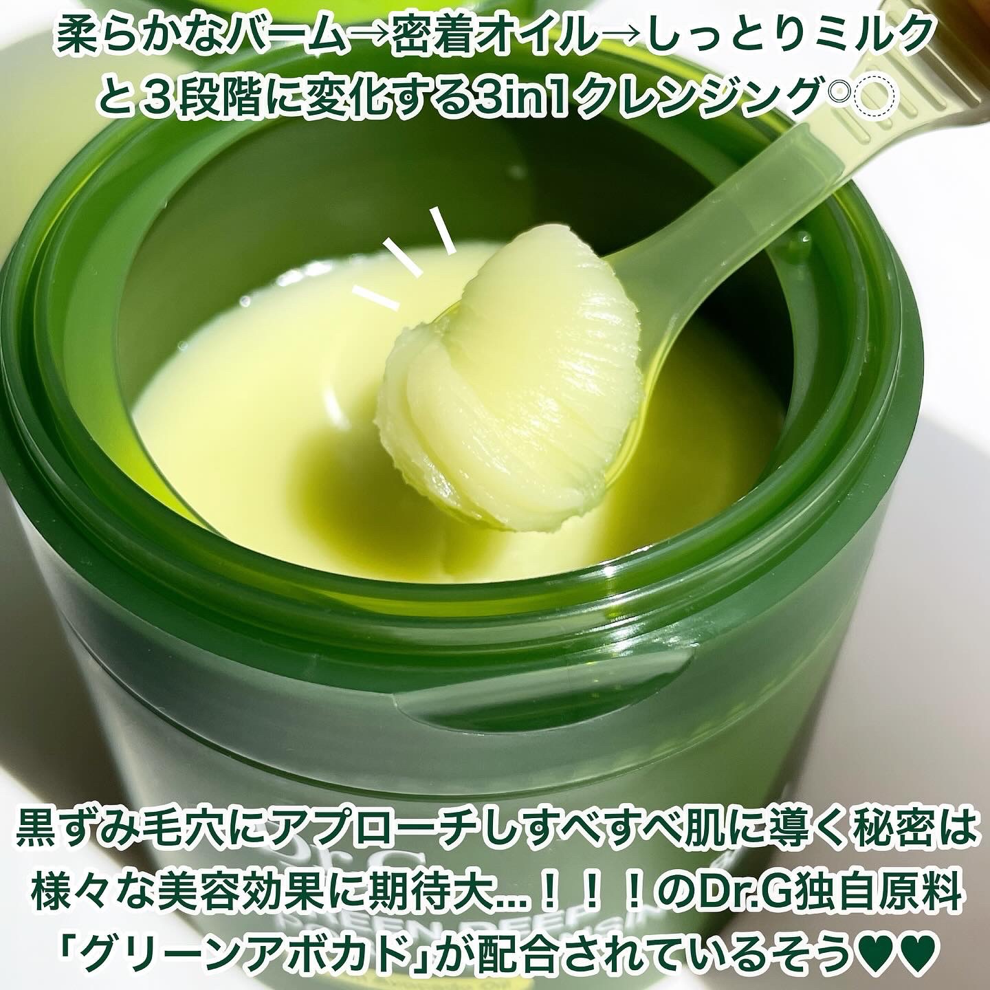 《Dr.G グリーンディープポアクレンジングバーム》@dr.g_official_jp様のグリーンディープポアクレンジングバーム3in1のアボカドシャーベットクレンジングバーム最初はバーム状メイク汚れなどを溶かしてオイルに変化ブラックヘッドや...