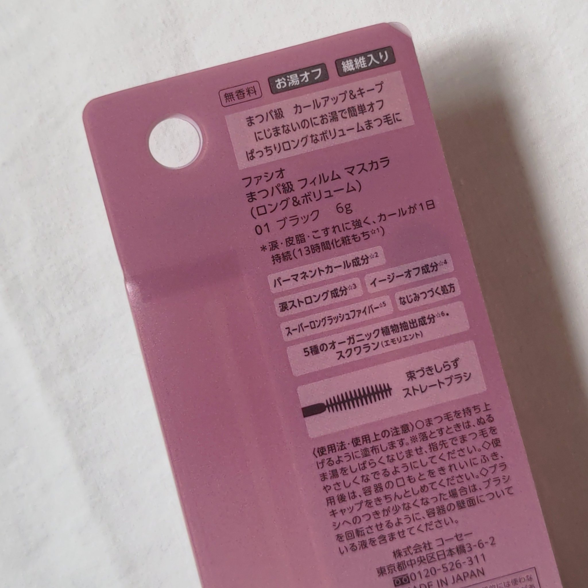 お湯落ちなのにキープ力◎!FASIOまつパ級フィルムマスカラ(ロング&ボリューム)1,320円(税込)お湯落ちマスカラを新規開拓したくなって、カールキープ力があって綺麗に長さが出るとSNSで評判のこちらを買ってみました。お湯落ちなのでやはり湿...