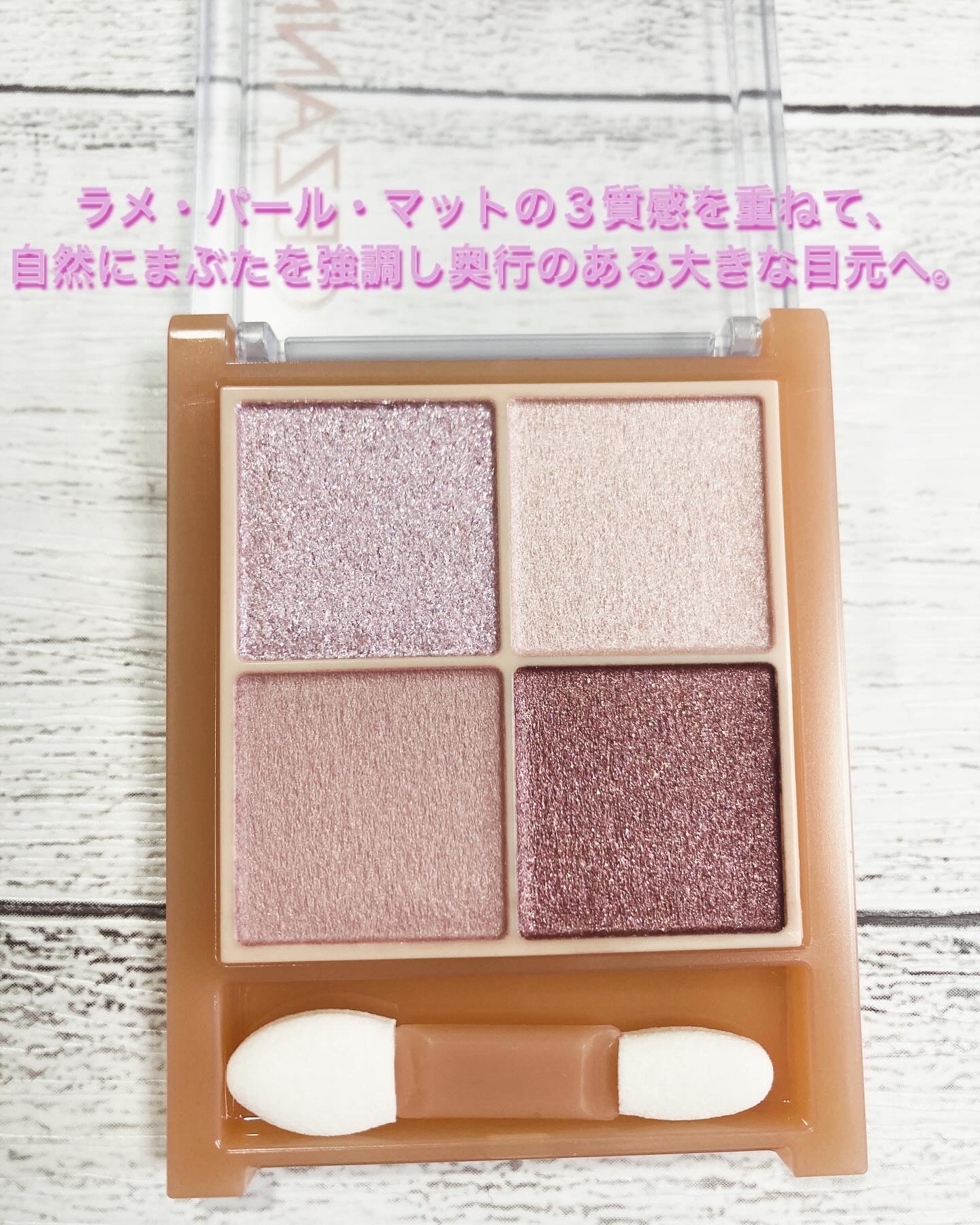 - ラメ・パール・マット3質感の4色アイシャドウ。 肌馴染みの良いベージュを基調としたカラー。ラメ・パール・マットの3質感を重ねて、自然にまぶたを強調し奥行のある大きな目元へ。 しっとり溶け込むような柔らかなパウダーなので、スルスル伸びてまぶたにピタッと密着。保湿成分(スクワラン・ホホバ種子油)配合。