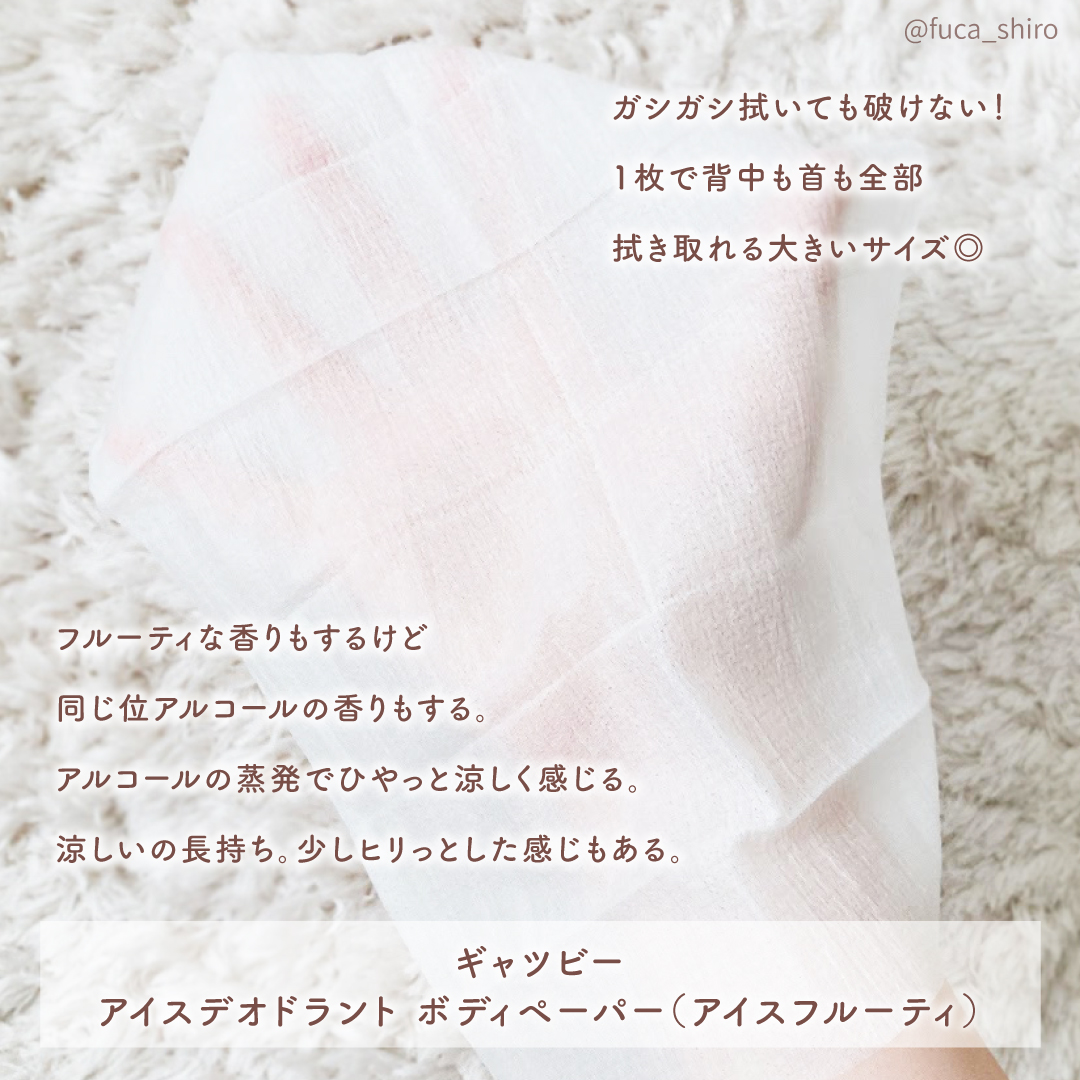 ガシガシ拭けて気持ちいい〜ベタベタ汗もすっきりさっぱり!◻️GATSBYアイスデオドラントボディペーパーアイスフルーティ<徳用タイプ>¥605(税込)人気のギャツビーのボディシート使ってみたよ!シートは凹凸のある天然パルプ素材でどちらかという...