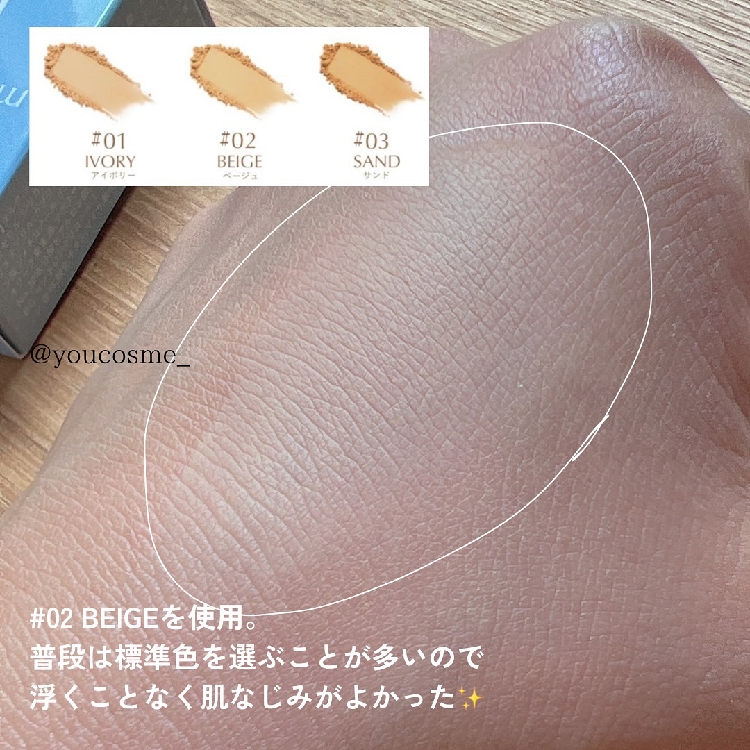 - 【#01 IVORY】 タルク,酸化チタン,マイカ,ジメチコン,ナイロン-12,トリ(カプリル酸/カプリン酸)グリセリル,シリカ,トリエチルヘキサノイン,酸化鉄,ミネラルオイル,リンゴ酸ジイソステアリル,酸化鉄,カプリル酸グリセリル,エチルヘキシルグリセリン,ステアリン酸ジメチコノール,酸化鉄,香料,リン酸アスコルビルMg,酢酸トコフェロール,パール,オリーブ果実油,水,ツボクサエキス,BG,ペンチレングリコール,1,2-ヘキサンジオール,ヒアルロン酸Na,アセチルヒアルロン酸Na,加水分解ヒアルロン酸,加水分解ヒアルロン酸Na,ヒアルロン酸,ヒドロキシアセトフェノン 【#02 BEIGE】 タルク,酸化チタン,マイカ,ジメチコン,ナイロン-12,トリ(カプリル酸/カプリン酸)グリセリル,シリカ,酸化鉄,トリエチルヘキサノイン,ミネラルオイル,リンゴ酸ジイソステアリル,酸化鉄,酸化鉄,カプリル酸グリセリル,エチルヘキシルグリセリン,ステアリン酸ジメチコノール,香料,リン酸アスコルビルMg,酢酸トコフェロール,パール,オリーブ果実油,水,ツボクサエキス,BG,ペンチレングリコール,1,2-ヘキサンジオール,ヒアルロン酸Na,アセチルヒアルロン酸Na,加水分解ヒアルロン酸,加水分解ヒアルロン酸Na,ヒアルロン酸,ヒドロキシアセトフェノン 【#03 SAND】 タルク,酸化チタン,マイカ,ジメチコン,ナイロン-12,トリ(カプリル酸/カプリン酸)グリセリル,シリカ,酸化鉄,トリエチルヘキサノイン,ミネラルオイル,酸化鉄,リンゴ酸ジイソステアリル,酸化鉄,カプリル酸グリセリル,エチルヘキシルグリセリン,ステアリン酸ジメチコノール,香料,リン酸アスコルビルMg,酢酸トコフェロール,パール,オリーブ果実油,水,ツボクサエキス,BG,ペンチレングリコール,1,2-ヘキサンジオール,ヒアルロン酸Na,アセチルヒアルロン酸Na,加水分解ヒアルロン酸,加水分解ヒアルロン酸Na,ヒアルロン酸,ヒドロキシアセトフェノン