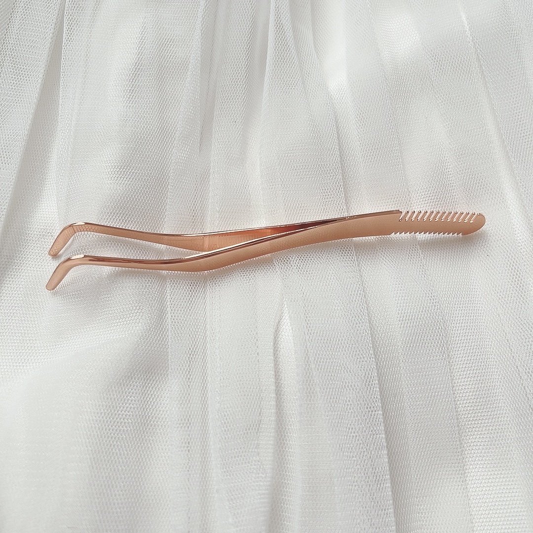 - 束感まつげを作るコーミングピンセット コーム付きのピンセットでアイドル風の束感まつげが簡単に! 「梳かす」「束ねる」「挟む」機能をひとつにまとめた3 in 1ツール ●トリミングコーム:メイク前のブラッシング、マスカラのダマ取りに ●ざっくりコーム:まつ毛をまとめて毛束を作る ●仕上げピン:ラウンド形状のピン先で安心!毛先をつまんで整える 【ご使用方法】 1.アイラッシュカーラーでまつげをカールさせた後、マスカラを適量塗布してください。 2.トリミングコームでマスカラのダマを取ります。 3.ざっくりコームをまつげの根元に当てて、左右に揺らします。束ができたら、毛先に向かってスッと抜いてください。 4.ピン部分で毛先を挟み、まつげの形や流れを整えます。 ※束になりにくい時は、ピンにマスカラを付けて毛束をまとめるとGOOD! 【お手入れ方法】 ご使用後は本体の汚れをティッシュペーパーなどで拭き取り、いつも清潔にご使用ください。 コーム部分についたマスカラが固まってしまった場合は、中性洗剤を薄く溶かしたぬるま湯にしばらく浸してから、軽く歯ブラシなどで洗い落とし、よくすすいだ後、水気を拭き取り保管してください。