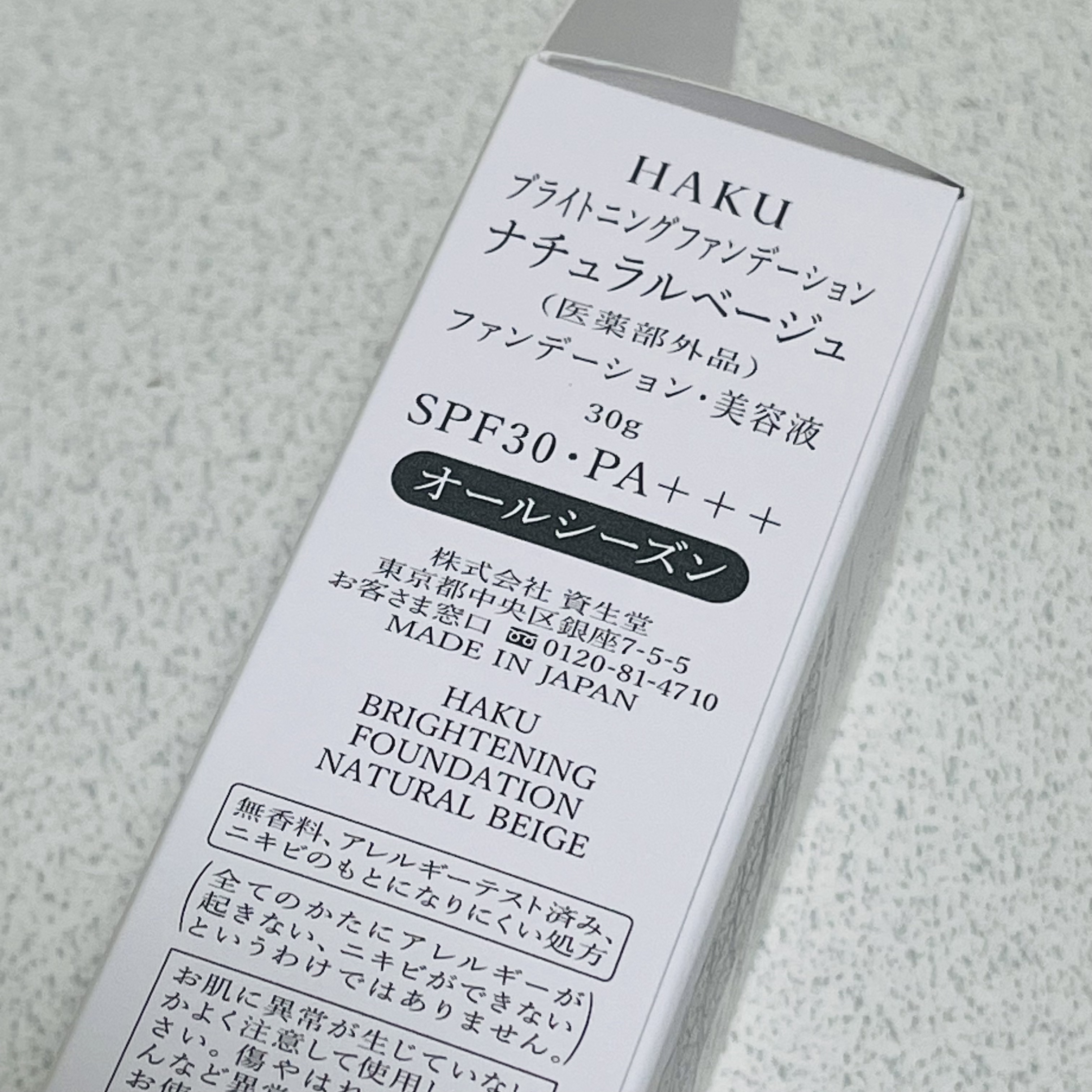 - SPF30 PA+++ 美白ケアしながら密着してシミカバーするファンデーション。 美白有効成分がメラニンの生成を抑え、シミ・そばかすを防ぎます。 軽やかに広がり、気になるシミや色ムラに密着して目立たせず、みずみずしいうるおいが長時間続きます。 明るく自然な仕上がりで、シミの目立たない、美発光肌へ。 無香料 (販売名:HAKU ブライトニングファンデーション)