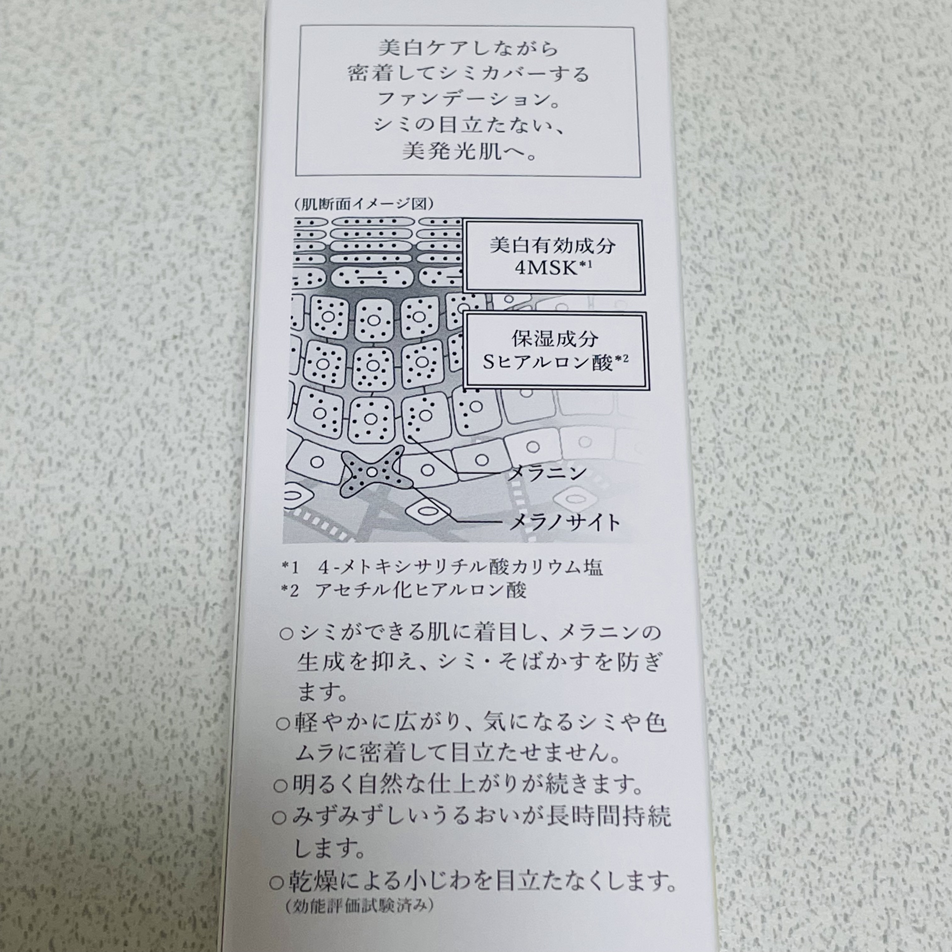 - <ライトベージュ> 有効成分 4-メトキシサリチル酸カリウム塩、酢酸DL-α-トコフェロール その他の成分 アセチル化ヒアルロン酸ナトリウム、メチルポリシロキサン、合成金雲母、酸化チタン、アセンヤクエキス、エクトイン、2-O-エチル-L-アスコルビン酸、チャエキス(1)、精製水、デカメチルテトラシロキサン、エタノール、濃グリセリン、ナイロン末、パラメトキシケイ皮酸2-エチルヘキシル、コハク酸ジ2-エチルヘキシル、PEG-9 ポリジメチルシロキシエチル ジメチコン、ポリオキシエチレン・メチルポリシロキサン共重合体、セスキイソステアリン酸ソルビタン、水酸化アルミニウム、トリメチルシロキシケイ酸、ステアリン酸、ジメチルジステアリルアンモニウムヘクトライト、架橋型ポリエーテル変性シリコーン混合物、エデト酸三ナトリウム、テトラヒドロテトラメチルシクロテトラシロキサン、ジブチルヒドロキシトルエン、テトラデセン、クエン酸、クエン酸ナトリウム、d-δ-トコフェロール、ジプロピレングリコール、ピロ亜硫酸ナトリウム、セバシン酸ジイソプロピル、ステアリン酸マグネシウム、フェノキシエタノール、黄酸化鉄、ベンガラ、黒酸化鉄 <ナチュラルベージュ> 有効成分 4-メトキシサリチル酸カリウム塩、酢酸DL-α-トコフェロール その他の成分 アセチル化ヒアルロン酸ナトリウム、メチルポリシロキサン、合成金雲母、酸化チタン、アセンヤクエキス、エクトイン、2-O-エチル-L-アスコルビン酸、チャエキス(1)、精製水、デカメチルテトラシロキサン、エタノール、濃グリセリン、ナイロン末、パラメトキシケイ皮酸2-エチルヘキシル、コハク酸ジ2-エチルヘキシル、PEG-9 ポリジメチルシロキシエチル ジメチコン、ポリオキシエチレン・メチルポリシロキサン共重合体、セスキイソステアリン酸ソルビタン、水酸化アルミニウム、トリメチルシロキシケイ酸、ステアリン酸、ジメチルジステアリルアンモニウムヘクトライト、架橋型ポリエーテル変性シリコーン混合物、エデト酸三ナトリウム、テトラヒドロテトラメチルシクロテトラシロキサン、テトラデセン、ジブチルヒドロキシトルエン、クエン酸、クエン酸ナトリウム、d-δ-トコフェロール、ジプロピレングリコール、ピロ亜硫酸ナトリウム、セバシン酸ジイソプロピル、ステアリン酸マグネシウム、フェノキシエタノール、黄酸化鉄、ベンガラ、黒酸化鉄