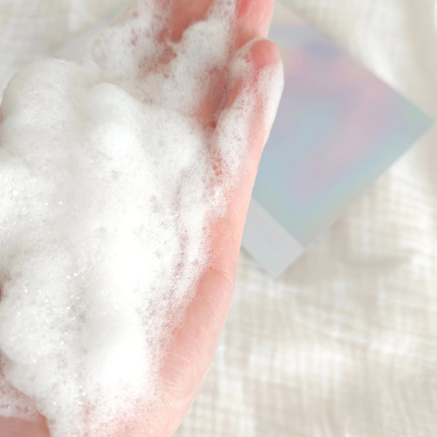 ものすごく独特で、織物の製造過程から発生する高保湿成分を含んだ天然シルクの束を固形石鹸に閉じ込めています。 濃密な泡と柔らかい絹糸で肌をマッサージすることにより、ゴワゴワの肌もツヤツヤになるそうです。 濱縮緬マッサージングソープは、実はきぬいとが現れた面でお肌をマッサージしながら、直接洗うのをメーカーさんではオススメされています。 肌が敏感な片やニキビの片は、泡立てネットを使ってモコモコ泡を作ってから優しく洗いましょう! 泡立てネットで泡立てると、濃厚なモコモコ泡が出来上がり! 洗いあがりは、突っ張らないけど、サッパリと洗い上がる使用感です。 濱縮緬マッサージングソープは男女兼用で使えちゃいます。
