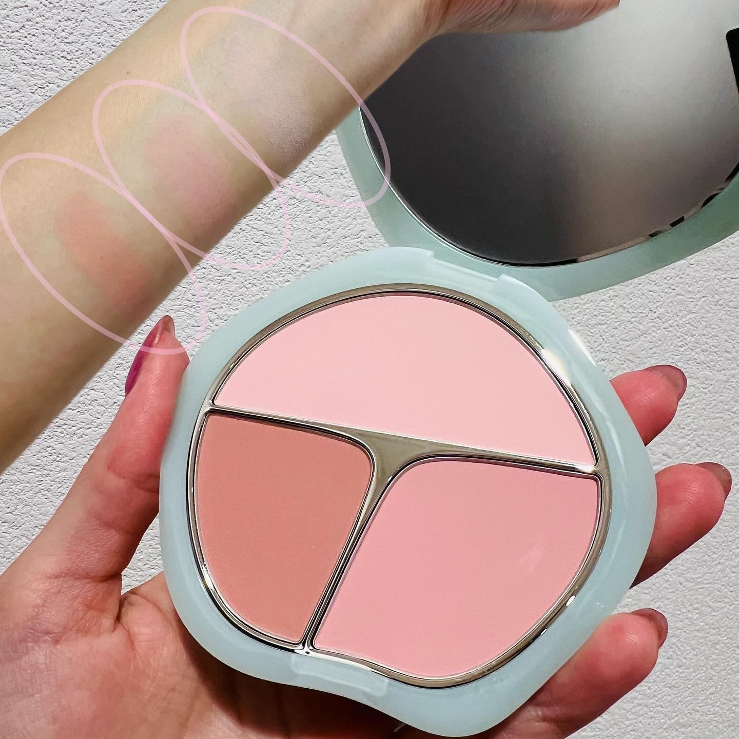 TIMAGE3色チークパレード@timage_jp様#A01ピンク系春の訪れのような桜咲くカラーパッと明るい青みピンクが特徴のパレット指で塗るよりパフや筆で塗った方が鮮やかに発色されたよ💞マットな質感で毛穴レスな頬が作れてしまうのが驚き!いつ...