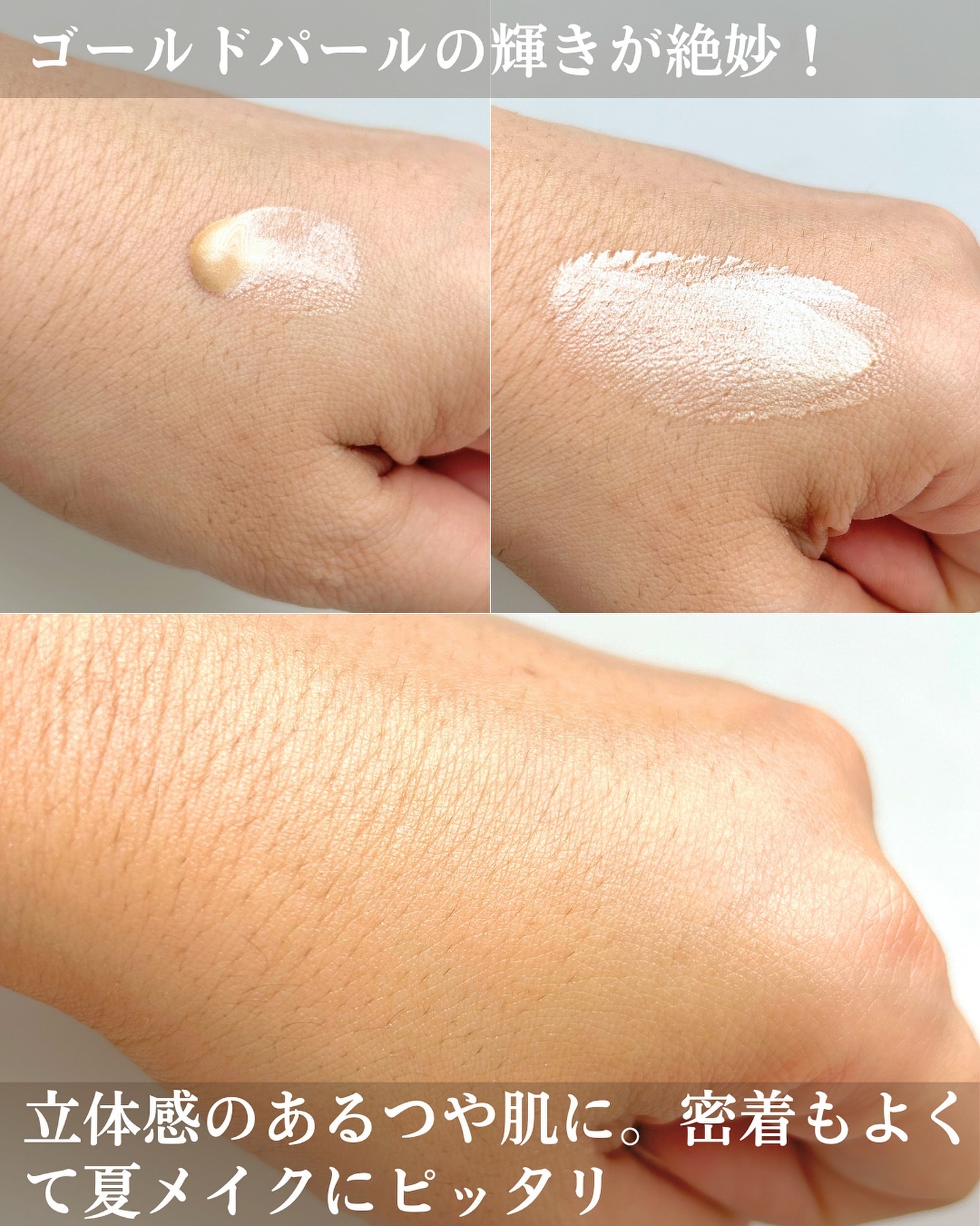 スキンケアとメイクアップを融合させた新感覚アイテム!肌にゴールドのツヤをもたらしつつ、自然なトーンアップ感で明るさもプラスしてくれます。 みずみずしい輝きでデイリー使いにも凄く良いです。保湿セラムとしても、化粧下地やハイライターとしてもいろんな使い方ができます。 とても軽いテクスチャーでベタつかず自然に馴染む感じが心地いいです。