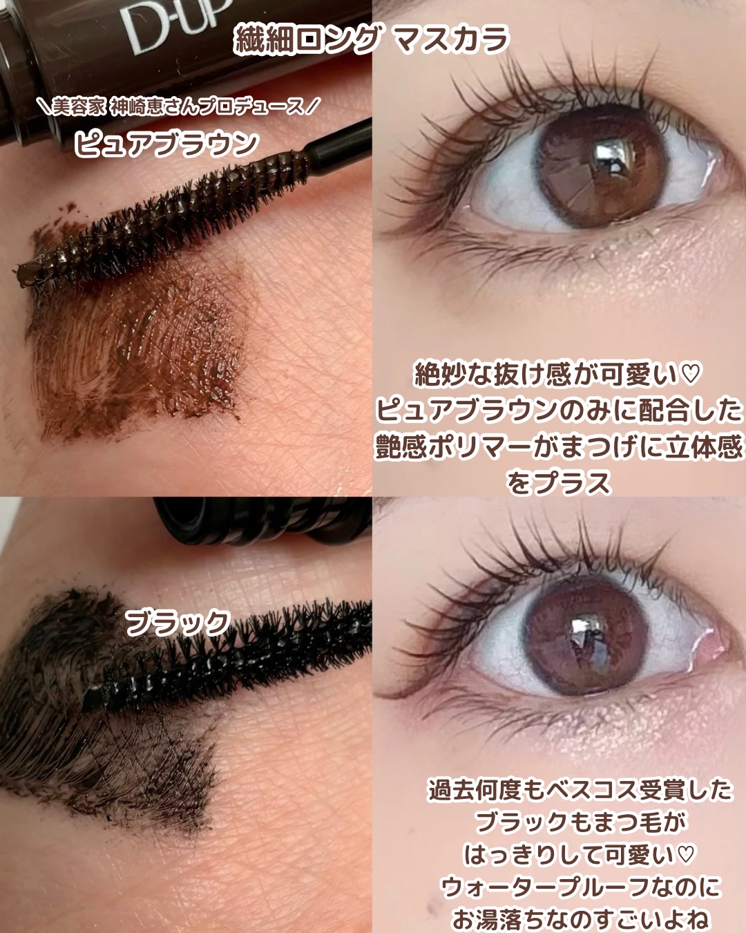 美容家の神崎恵さんがプロデュースされたということで、ベスコス総なめにしているマスカラ👀 ブラックよりはっきりはしないけど、まつ毛をしっかり強調してくれる絶妙なブラウンで目力はあるのに目元が優しい印象になるのがお気に入り🤎 ほの甘ダークブラウンとはまさにこの色のこと!チョコレートみたいな色味が可愛い😍 ウォータープルーフだから落ちづらいのもお気に入りポイント✨ D-UPのアイテムは可愛いのに実用性の高い色味が多いから、色んなカラーを挑戦しやすいよね🥰
