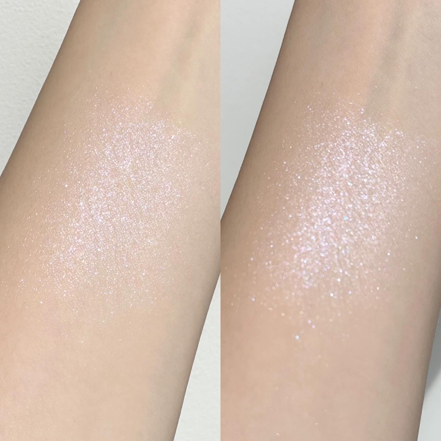 手に試した感じではベースのブルーは弱く、ラメ自体がブルーで可愛すぎる…! BAさんはパウダーアイシャドウのベースにもおすすめと教えてくれたので、 今日はこちらをベースにピンクブラウン系の アイシャドウを使ってメイクしてみたよ🫶🏻 肌に伸ばすとすぐにサラサラになるから ベタベタが残ったりしないし、 パウダーアイシャドウの上に重ねてもヨレない◎