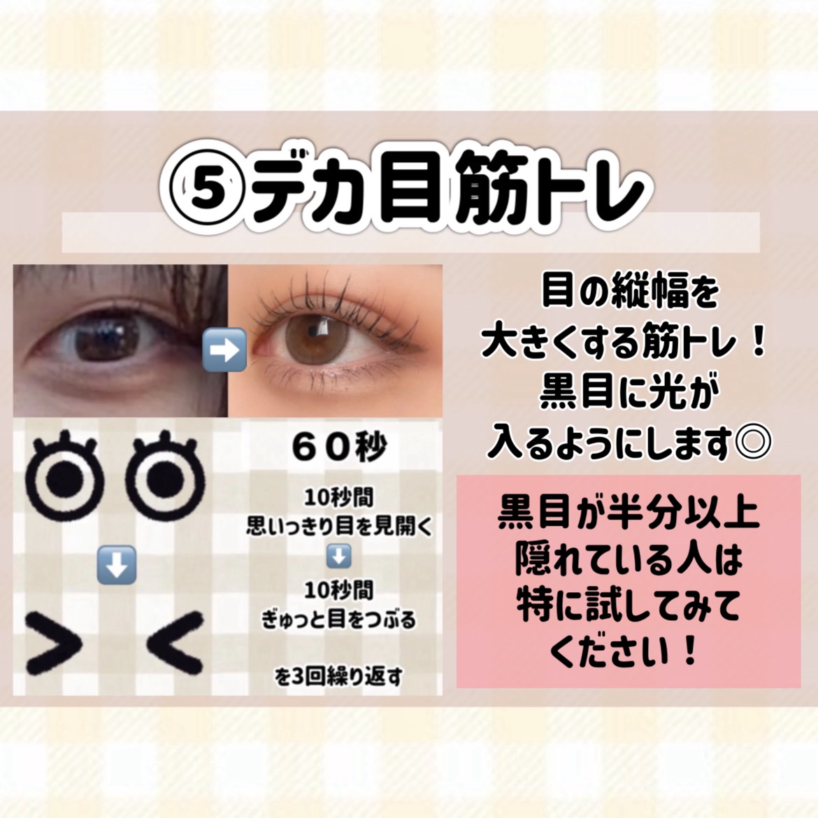 【瞼の筋トレ】について詳しく解説!!これさえすれば絶対変われます!!!瞼の筋トレって?という方は、画像をご覧下さい‼️これがないと私は今頃二重になってなかった…と言っても過言ではないくらい、私の癖付けには欠かせなかったものです!!今回は、昔からしている筋トレ1つと、最近思いついて実践している筋トレ2つをご紹介します!!どれもすごく簡単なので、ぜひ試してみてください📷Q 一日どのくらいしてた?A とにかく暇さえあればしていました!!1日30分の日もあれば、何時間もする日もありましたこの筋トレは、お風呂に入りながらや勉強しながら、スマホ見ながらでもできるのがいいところなので、スキマ時間を上手く活用するのがいいかな思います💭Q 今まで何回くらい筋肉痛になった?A 左右どちらも5回くらいだと思います!瞼が私より軽い方は、1、2回で十分スッキリすると思いますよ❣️Q どれくらいで筋肉痛になった?A 筋肉痛までは平均して2週間くらいかかりました!でもフォロワーさんの中には1日でなられた方も多くいらっしゃいますなのでその人の瞼や頑張り次第だと思います❣️Q 筋トレ1