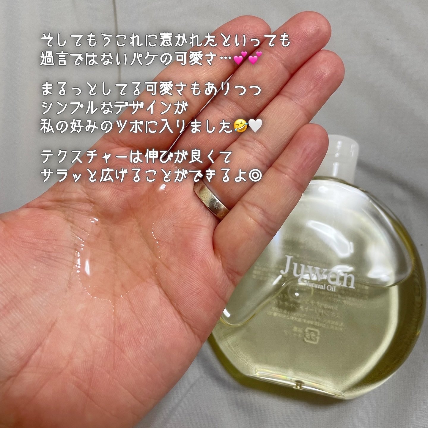 - POINT 01 Juwanナチュラルオイルはヒトの皮脂本来の脂肪酸バランスに着目。 馬油*1をメインに、ホホバ種子油(*1)、スクワラン(*1)、サトウキビ由来の水添ファルネセン*1の4種のオイルを配合。厳選された4種のオイルを独自設計により配合し、ヒトの皮脂構成に近いJuwanナチュラルオイルが誕生しました。皮脂に近いオイル設計であるため、肌なじみがよく、角質層へしっかり浸透し、肌を柔らかくしっとりと仕上げます。 (*1) エモリエント成分 POINT 02 各オイル成分がバランスよく肌へはたらきかけ、バリア機能をサポートします。 全身の保湿はもちろん、ザラつきが気になる箇所に週1〜2回素肌のクレンジング(もしくは洗顔料と合わせてメイク落とし)としてご使用頂くことをおすすめします。 肌をしっとり整え、ツヤ肌へ導くJuwanオリジナルオイルは美容オイルとしてのご使用はもちろん、オイルクレンジングとして毛穴の黒ずみケアにもお使いいただけます。 POINT03 鉱物油フリー・シリコンフリー・着色剤フリー・アルコールフリー・界面活性剤フリー・パラベンフリーでやさしい使い心地。年齢問わずお使いいただけますのでご家族で一緒にご使用いただけます。容量は毎日たっぷりお使いいただける100mlです。