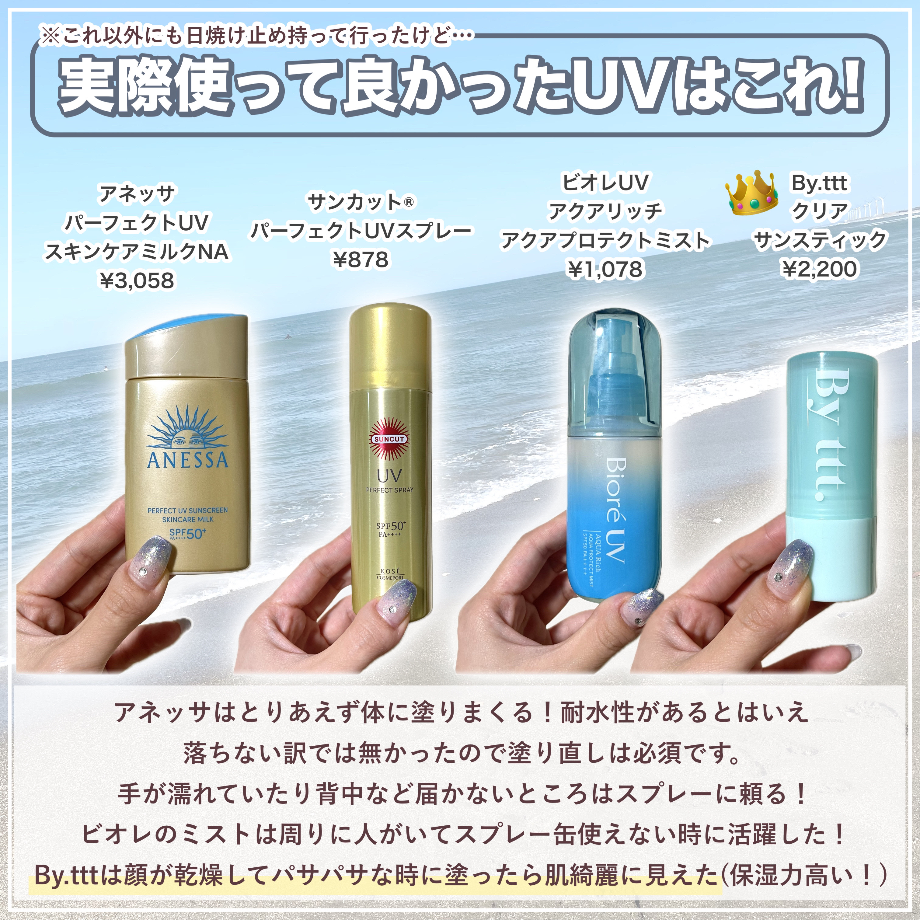 ニベアUVディーププロテクト&ケアミルクミスト日頃から愛用しているニベアの日焼け止め初めてミストタイプの日焼け止めを使って、今回の旅行に持って行ったらこんなに使いやすくて便利なの!?とびっくりしました。SPF50+PA++++なので紫外線が強...