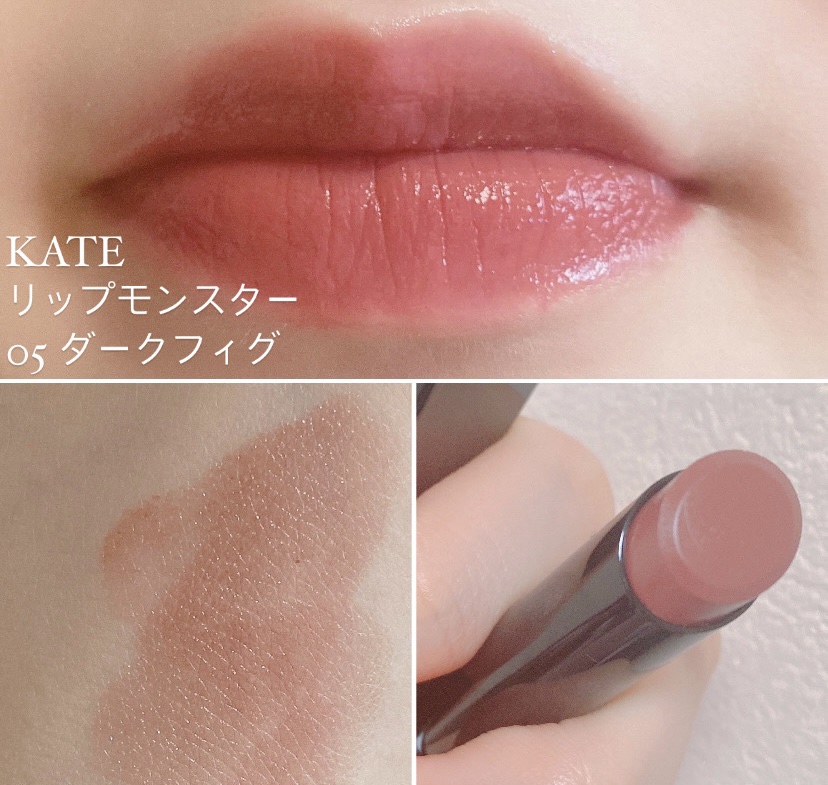 KATEケイトリップモンスター05 ダークフィグくすみが強いブラウンレッドカラー。でも、透け感もあって可愛い。塗ってしばらく放置するとティッシュオフしてもつかないし色持ちもよくてホント助かる!イエベもブルベも使いやすいニュートラルカラーじゃな...