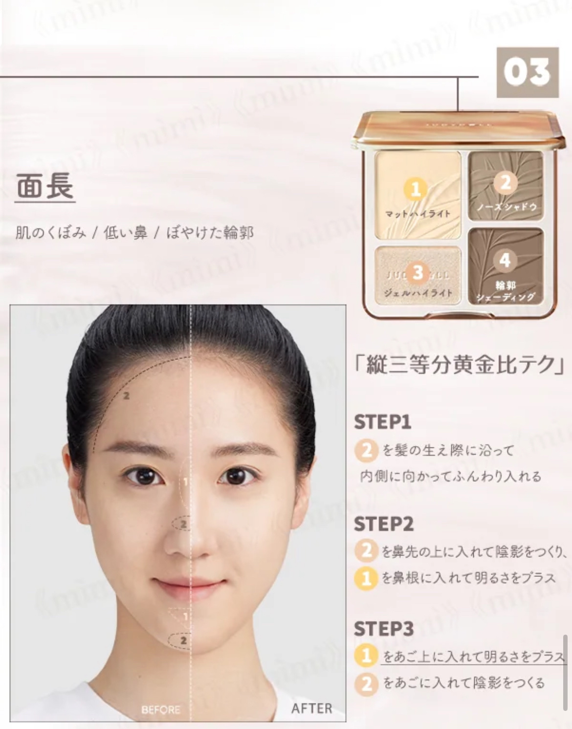 - ※2025年7月下旬以降、順次商品パッケージをリニューアル。 ※2025年12月上旬以降、順次一部商品成分をリニューアル。 尚、これにかかる商品の返品・交換は承っておりません。 ハイライト&シェーディング一体のパレットで誰でも簡単にメリハリのある立体顔*をマスター。 待望の日本初上陸! 2種類のハイライトと2色のシェーディング、光と影のオールインワンパレットで「生まれつき」のような立体感を演出。 メリハリマスターパレットがリニューアルして新登場! 垢抜けメイク&お直しには必須のマットハイライトが増量し、より使いやすくなりました! <01N クールトーン> 01N クールトーンはブルべさんや血色をプラスしたい方に。血色をプラスしながらも立体感も。 <02N ウォームトーン> 02N ウォームトーンはイエベさんやヘルシーな肌色の方に。立体的でクリアな素肌感を。 <04N ニュートラルトーン> ニュートラルトーンはすべての肌色の方に。膨張色でふっくら、やわらかい立体顔*を演出。 *メイクアップ効果による