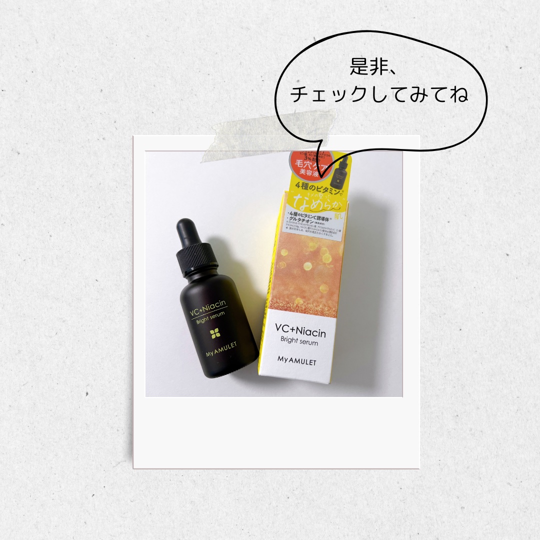 高機能ビタミンC誘導体のポアショット®を配合した、マイアミュレットの導入美容液。 なめらかな肌へサポートしてくれるんだって♡ テクスチャーはさらっとしていて、スーッとなじみの良い使い心地。