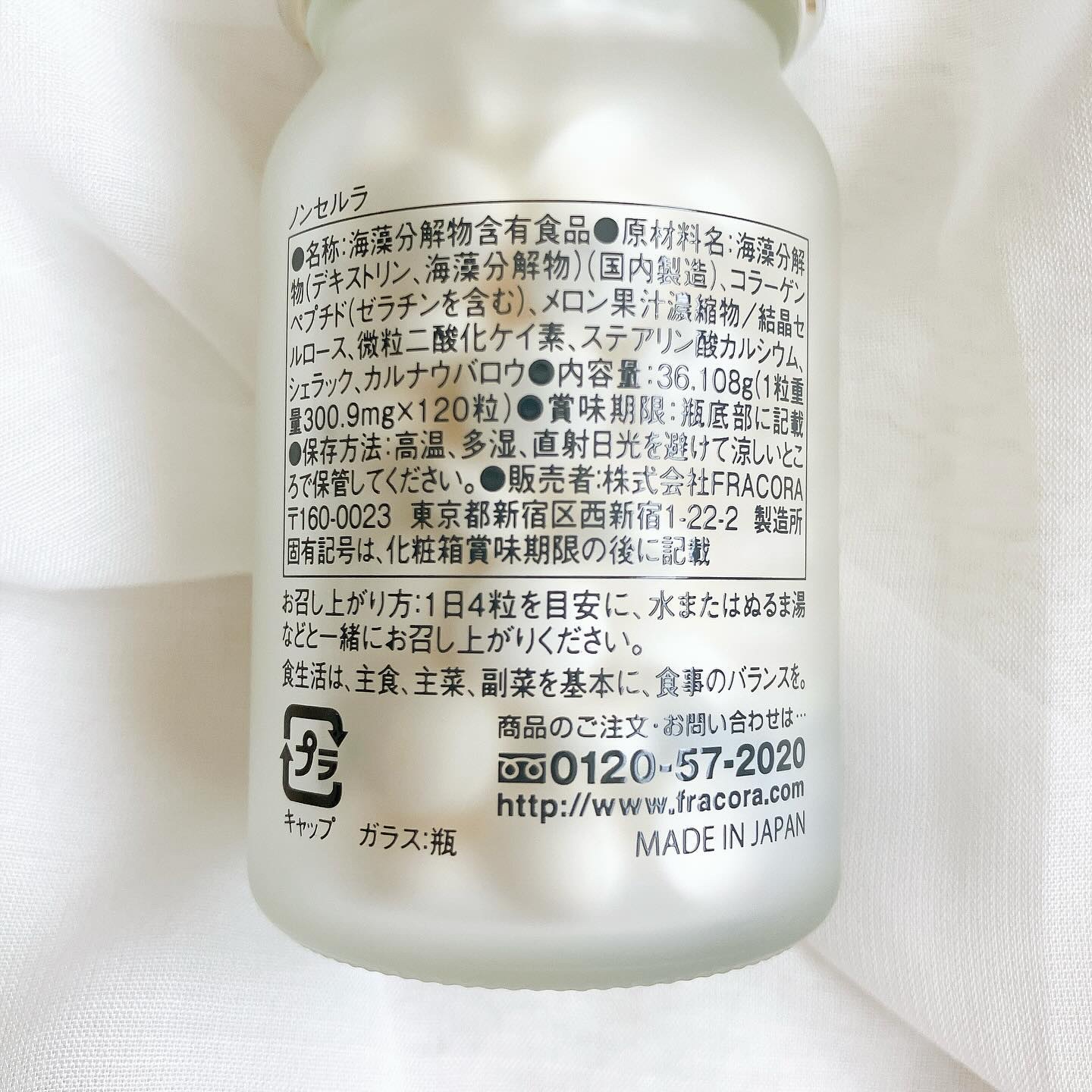 FRACORAのNon Celula(ノンセルラ)はセルライトケアしてる人のキレイをサポートするサプリ🫶 腐らないメロン由来の注目成分「SOD*」、体内環境をサポートする海藻由来成分「フコース」の組み合わせで美をサポート❤︎´- ツルッとした錠剤で無味無臭、粒も大きくなくて飲みやすかった!