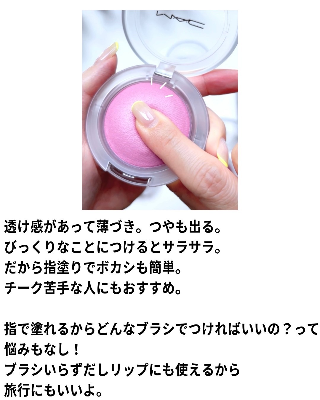 - 1. 頬を内からぽっと染めるような、とびきりイノセントな血色感 弾力のある”おもち”テクスチャーでツヤ感のある肌を演出しながらも、仕上がりはサラリ。毛穴も目立ちにくい印象に。 2. ジャストスワイプ!指先だけでシームレスに素肌と一体化 メイクの楽しさを追求するMACだから開発できた、クリーム&パウダー フォーミュラ。ワンタッチでチークが決まる絶妙な馴染み感とナチュラルな発色。 3. スムーズなタッチを叶える、3つのスキンケア成分を新配合 ビタミンE*1、ホホバオイル*2、グレープシードオイル*3を配合。 4. チークだけじゃない、リップもふわりと彩るマルチユース いつでもどこでも、簡単にワントーンメイクが完成 5. 心弾むカラーバリエーションをクリーン・フォーミュラで実現 パラベン・鉱物油・エタノール・香料フリー。コンパクトには環境に配慮したPCR素材43%使用。 *1 酢酸トコフェロール、*2 ホホバ種子油、*3 ブドウ種子油(全て整肌成分)