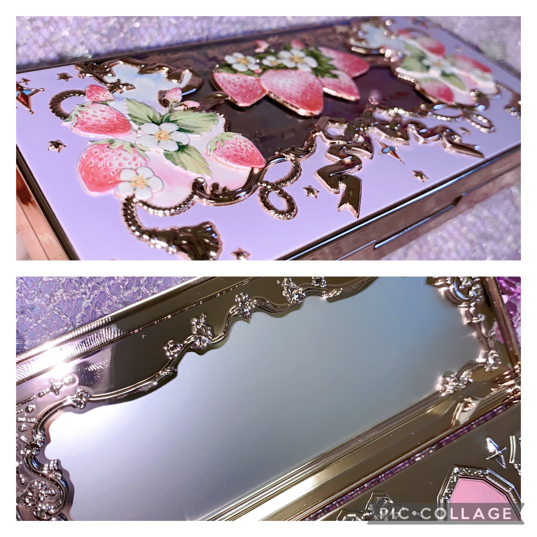 - まるで宝石箱“4+1”マット4色・宝石ラメ1色の粉飛びしにくく心地よいやわらかな感触のパウダーが軽やかにフィットし、洗練された目もとが作れる美しいグラデーションが実現するブラウンメインのアイシャドウパレット。ケースはリボンや七色貝殻に甘い苺スイーツを乗せた宝石箱のデザイン。