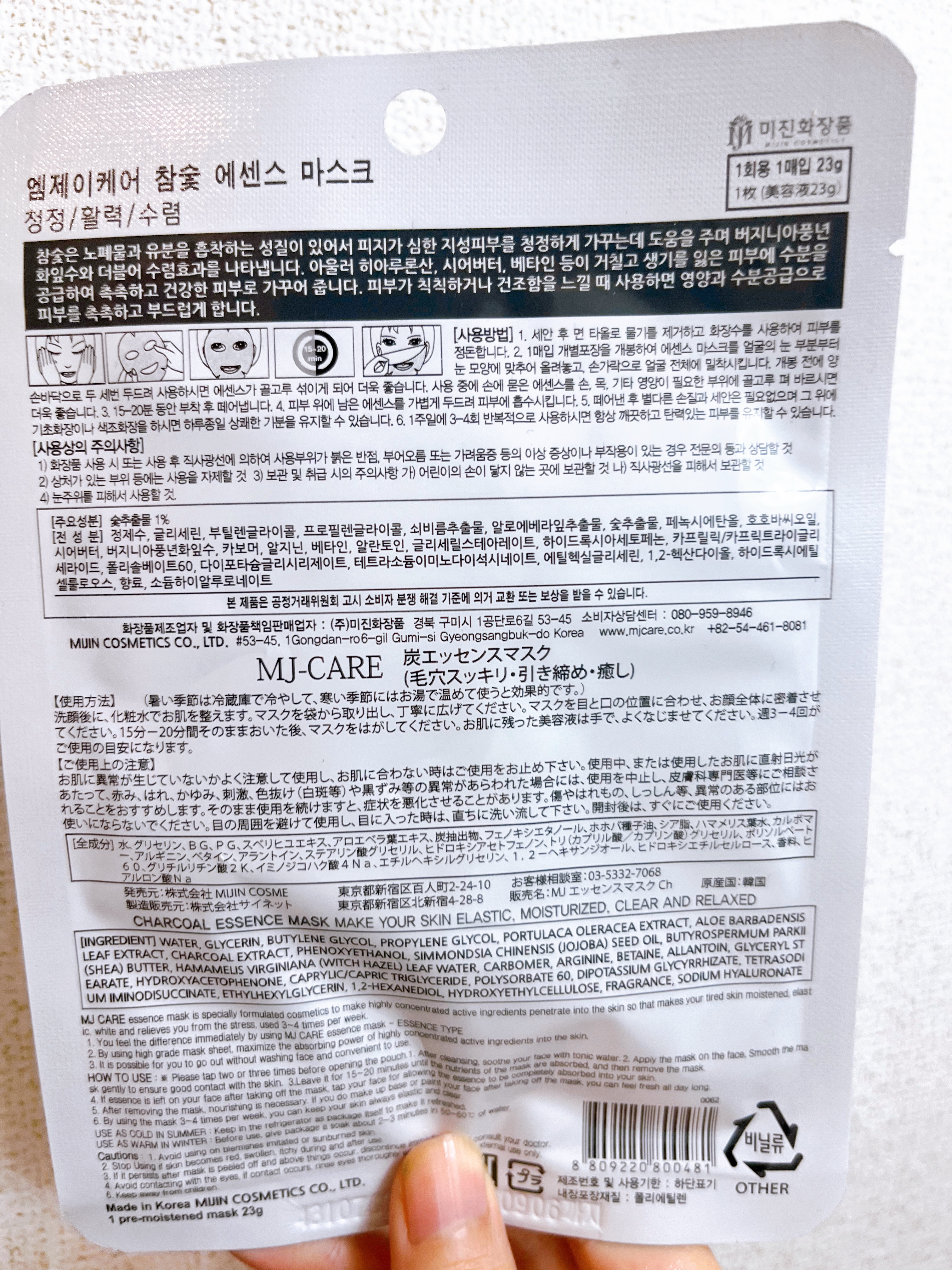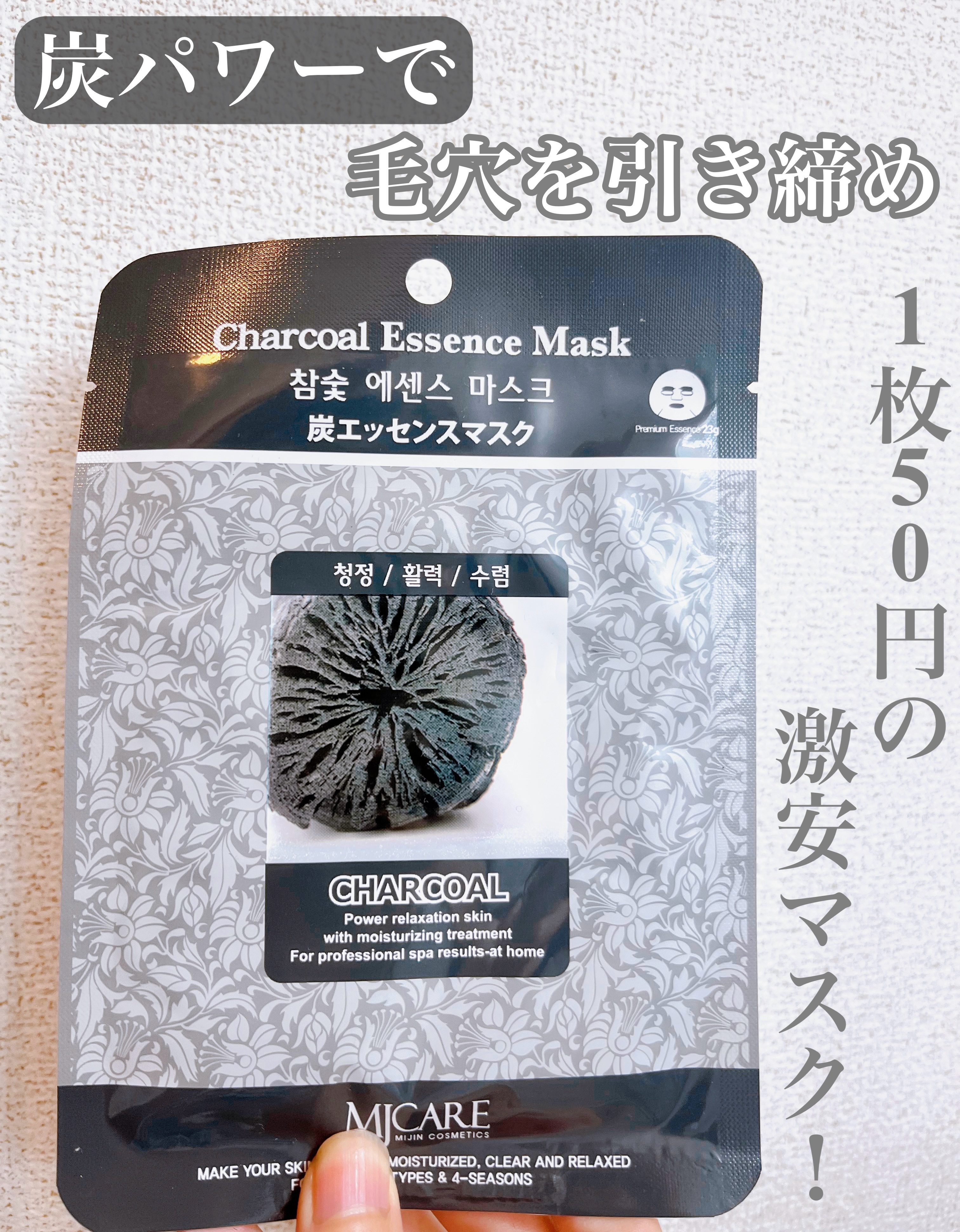 チャコール(炭)成分配合で肌のキメを整える🌟 植物エキスではしっかりと保湿してくれます🤩 ちょうど良い厚さのシート! テクスチャーはトロッとして美容液もちゃんとヒタヒタ💓 保湿はしっかりとされましたが、使用中にかなり沁みました😢 肌のキメもそんな変化がない気がする…。
