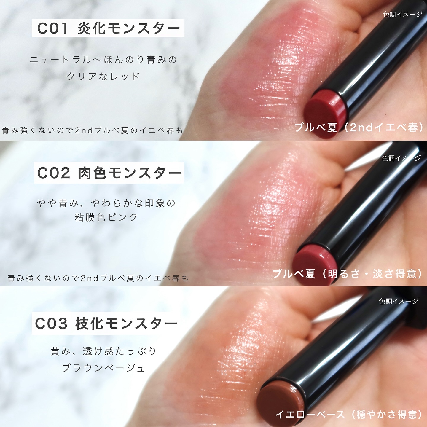色もちも良くって乾燥しにくいから文句のつけどころがない。 ☑︎201 Miro粘膜ピンクレッド→イエベ春・ブルベ夏 ☑︎203 Markじゅんわり多幸感コーラル→イエベ春 ☑︎204 Haveピュアなベイビーピンク→イエベ春・ブルベ夏(明るめ得意) ☑︎207 Depthレディな透けプラムレッド→ブルベ冬のデイリーブルベ夏の華やか ☑︎208 Poshニュートラルなレッド→ブルベ冬・イエベ春秋(鮮やか得意) ☑︎209 Near落ちついた洒落感オレンジ→イエベ春・イエベ秋(黄み得意) ☑︎213 Jeffブラウンが溶け込んだローズイエベ秋(2ndブルベ夏) ☑︎215 Lennaクリアで可憐な青みピンクブルベ夏冬(明るめ得意) ☑︎216 Winterディープなプラムレッドブルベ冬(青み得意)