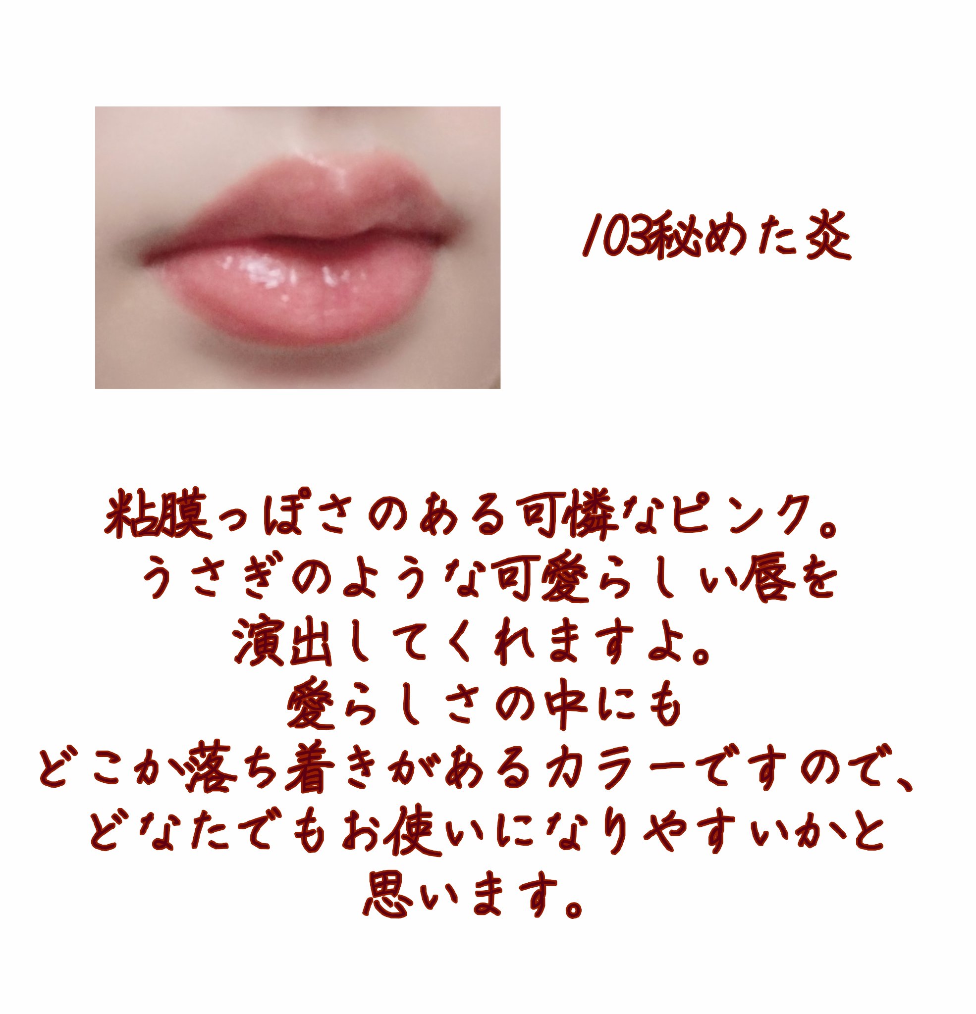 103秘めた炎 粘膜っぽさのある可憐なピンク。 104桜色のひと時 くすみ感のあるオールドピンクは桜のように優美で儚げ。 112真夜中の褒美 上品で深みのあるレッドブラウンの中にグリーンのパールがザックザクに入っていて、まるで聖夜に輝くイルミネーションのよう。