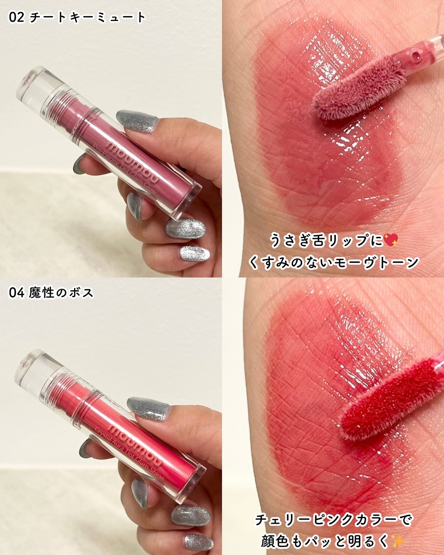 💘MOUMOUプロペアリングティント♡05ラブイットピンク♡02チートキーミュート05番(2枚目)はサラサラマット系リップで02番(3枚目)はつやつやリップ💄これは韓国でも日本でも1番人気のペアリングらしいᐡ⸝⸝>̫<⸝⸝ᐡソウルライフってイ...