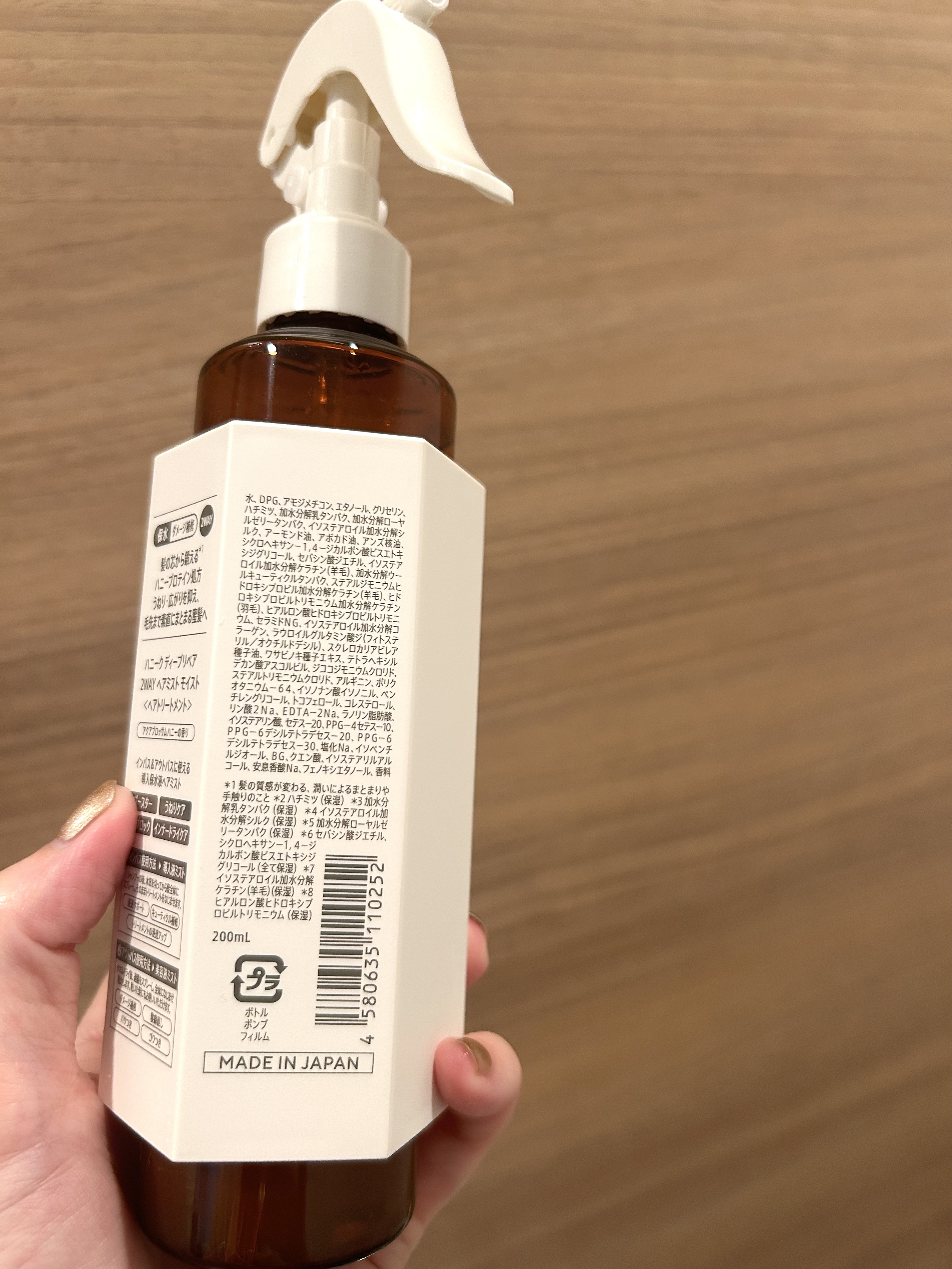 - 毛先まで素直にまとまる蜜髪へと導く「ハニープロテイン処方(保湿)」の2WAY導入保水液ヘアミスト。 髪内部の保水力をサポートするオーガニックマヌカハニー*1や、髪の芯から集中補修する3種のプロテイン*2など、髪の芯から鍛える*3成分を厳選して配合。 インバスとアウトバスの2WAYでマルチに使えます。シャンプーとトリートメントの間に使う導入液ミストとして使うことで、次に使うトリートメントの浸透をサポート。 うねり、湿気、髪の広がりが気になるときの美容液ミストとして、アウトバスケアにも使えます。アクアブロッサムハニーの香り *1 ハチミツ(保湿) *2 加水分解乳タンパク、イソステアロイル加水分解シルク、加水分解ローヤルゼリータンパク(全て保湿) *3 髪の質感が変わる、潤いによるまとまりや手触りのこと
