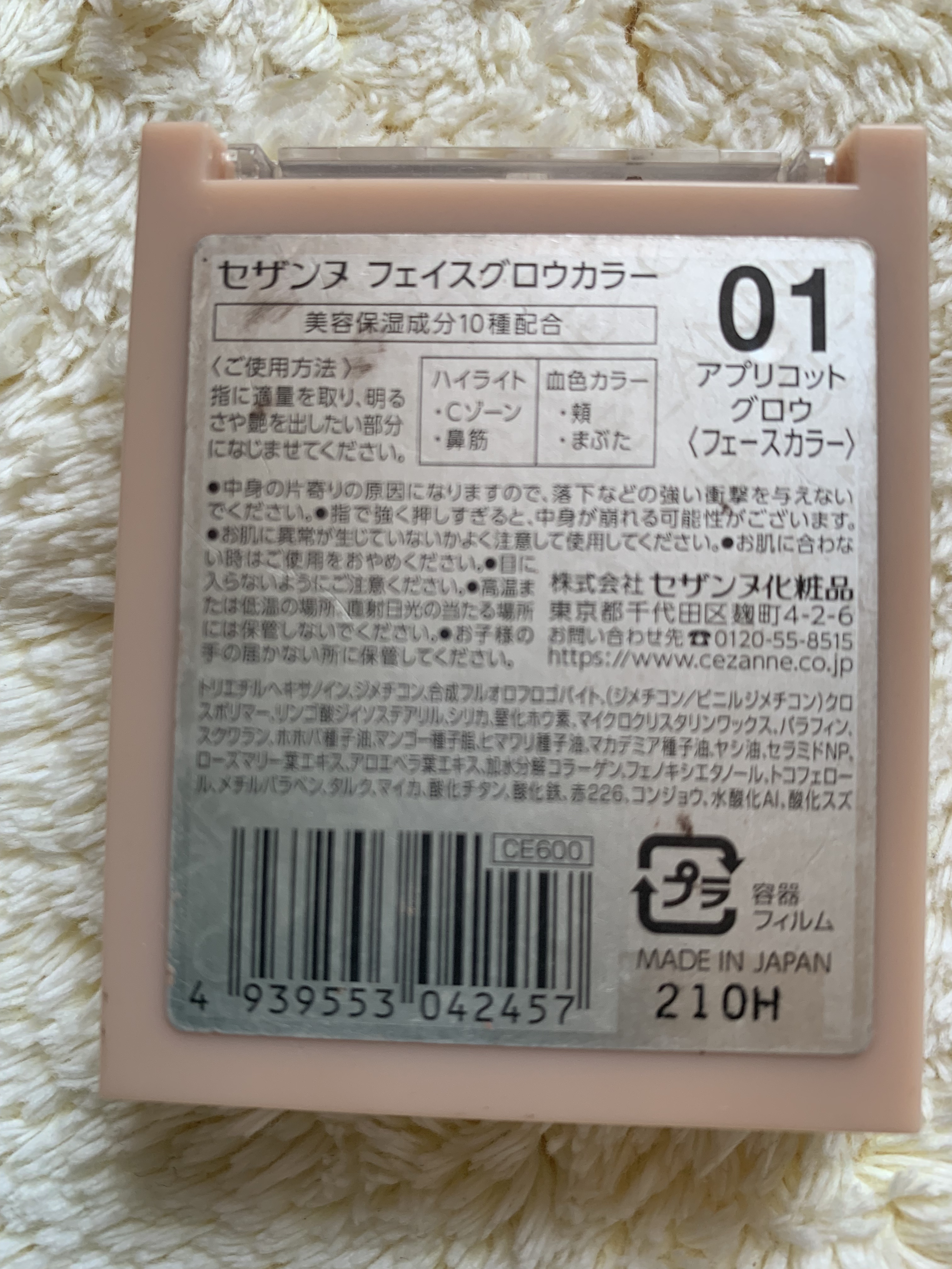 - <01 アプリコットグロウ> トリエチルヘキサノイン、ジメチコン、合成フルオロフロゴパイト、(ジメチコン/ビニルジメチコン)クロスポリマー、リンゴ酸ジイソステアリル、シリカ、窒化ホウ素、マイクロクリスタリンワックス、パラフィン、スクワラン、ホホバ種子油、マンゴー種子脂、ヒマワリ種子油、マカデミア種子油、ヤシ油、セラミドNP、ローズマリー葉エキス、アロエベラ葉エキス、加水分解コラーゲン、フェノキシエタノール、トコフェロール、メチルパラベン、タルク、マイカ、酸化チタン、酸化鉄、赤226、コンジョウ、水酸化Al、酸化スズ <02 ローズグロウ> トリエチルヘキサノイン、ジメチコン、合成フルオロフロゴパイト、(ジメチコン/ビニルジメチコン)クロスポリマー、リンゴ酸ジイソステアリル、シリカ、窒化ホウ素、マイクロクリスタリンワックス、パラフィン、スクワラン、ホホバ種子油、マンゴー種子脂、ヒマワリ種子油、マカデミア種子油、ヤシ油、セラミドNP、ローズマリー葉エキス、アロエベラ葉エキス、加水分解コラーゲン、フェノキシエタノール、トコフェロール、メチルパラベン、タルク、マイカ、酸化チタン、酸化鉄、赤226、コンジョウ、水酸化Al、酸化スズ、赤202 <03 ロマンスグロウ> トリエチルヘキサノイン、ジメチコン、合成フルオロフロゴパイト、(ジメチコン/ビニルジメチコン)クロスポリマー、リンゴ酸ジイソステアリル、シリカ、窒化ホウ素、マイクロクリスタリンワックス、パラフィン、スクワラン、ホホバ種子油、マンゴー種子脂、ヒマワリ種子油、マカデミア種子油、ヤシ油、セラミドNP、ローズマリー葉エキス、アロエベラ葉エキス、加水分解コラーゲン、フェノキシエタノール、トコフェロール、メチルパラベン、タルク、マイカ、酸化チタン、酸化鉄、赤226、コンジョウ、水酸化Al、酸化スズ、赤202 <SP1 ヨザクラグロウ> トリエチルヘキサノイン、ジメチコン、合成フルオロフロゴパイト、(ジメチコン/ビニルジメチコン)クロスポリマー、リンゴ酸ジイソステアリル、シリカ、窒化ホウ素、マイクロクリスタリンワックス、パラフィン、スクワラン、ホホバ種子油、マンゴー種子脂、ヒマワリ種子油、マカデミア種子油、ヤシ油、セラミドNP、ローズマリー葉エキス、アロエベラ葉エキス、加水分解コラーゲン、フェノキシエタノール、トコフェロール、メチルパラベン、タルク、マイカ、酸化チタン、酸化鉄、赤226、赤202、コンジョウ、グンジョウ、水酸化Al、酸化スズ