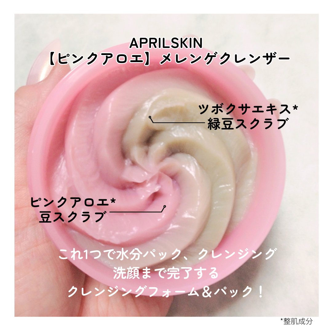 APRILSKINピンクアロエメレンゲクレンザー洗顔、パックにも使える新感覚2wayクレンザー🫧ピンクアロエや豆スクラブ、グリーンの部分はツボクサエキスや緑豆スクラブなどが配合されてるみたい🌿✨肌表面のザラつきを滑らかにしてくれて、汚れもスッ...