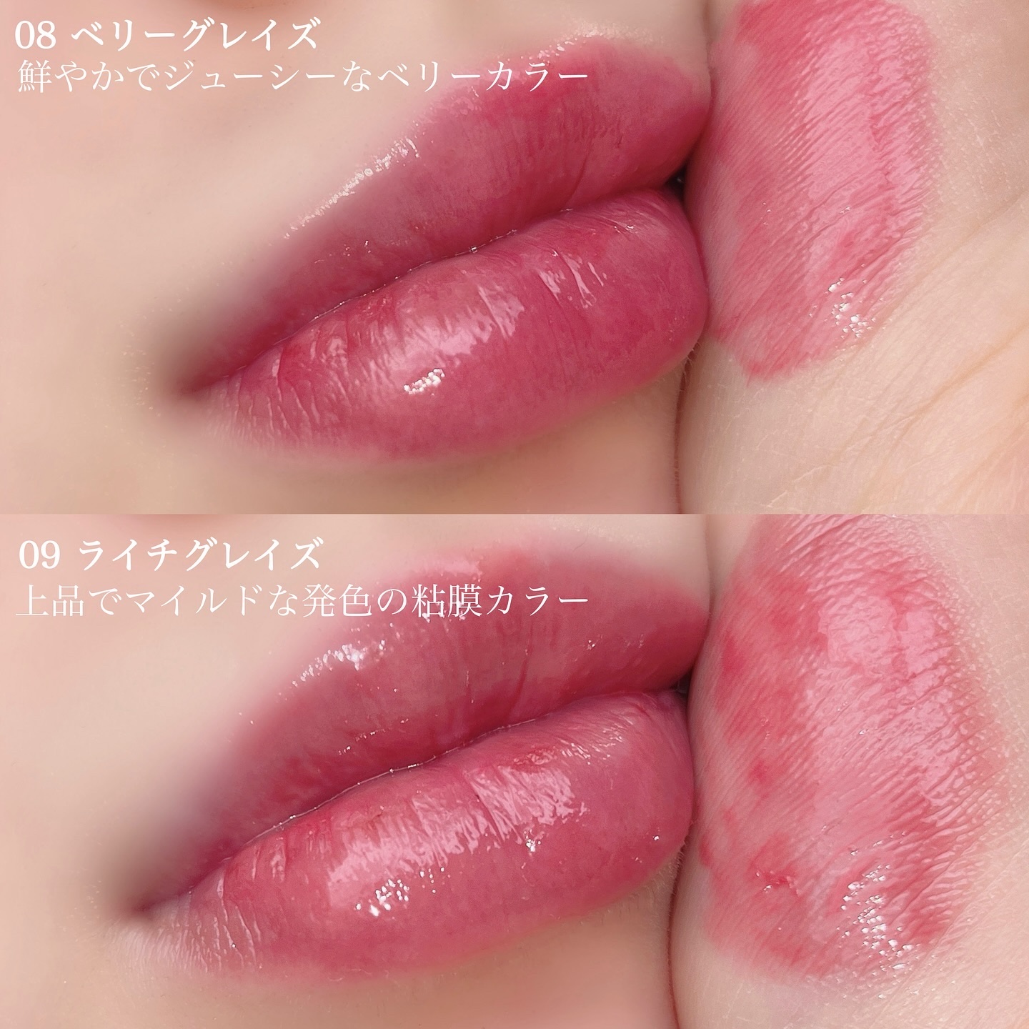 - - ベタつかない心地よさ、究極に軽い使用感。なめらかなテクスチャー。 - 唇の温度で溶けるウォータリーモイスチャーフォーミュラで手軽に演出できるグレイズリップ - グレイズからインスピレーションを受けたおいしそうなカラー 。塗り重ねても濁りなく維持される澄んだカラー感 - 透き通るように輝く独自のグレイズ光沢感、唇にふっくらとしたシロップコーティングの光沢感を演出