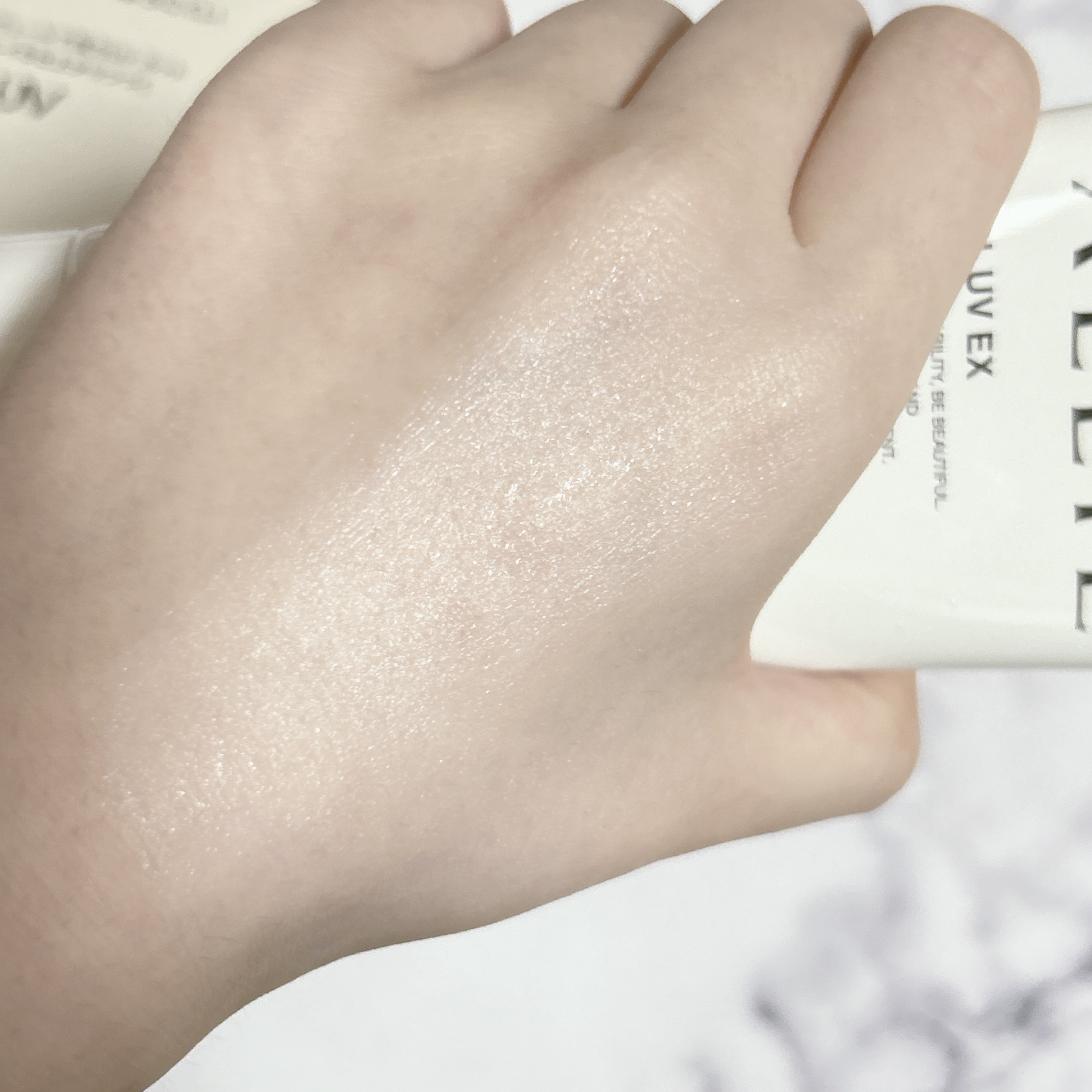 限定色のブルーがかわいすぎた……!! 淡いブルーカラーの中の繊細パール・ラメがしっかりキラキラなツヤ感✨ ブルーだから肌に自然な透明感が出るし、サラッと仕上がりだから夏にピッタリ☀️
