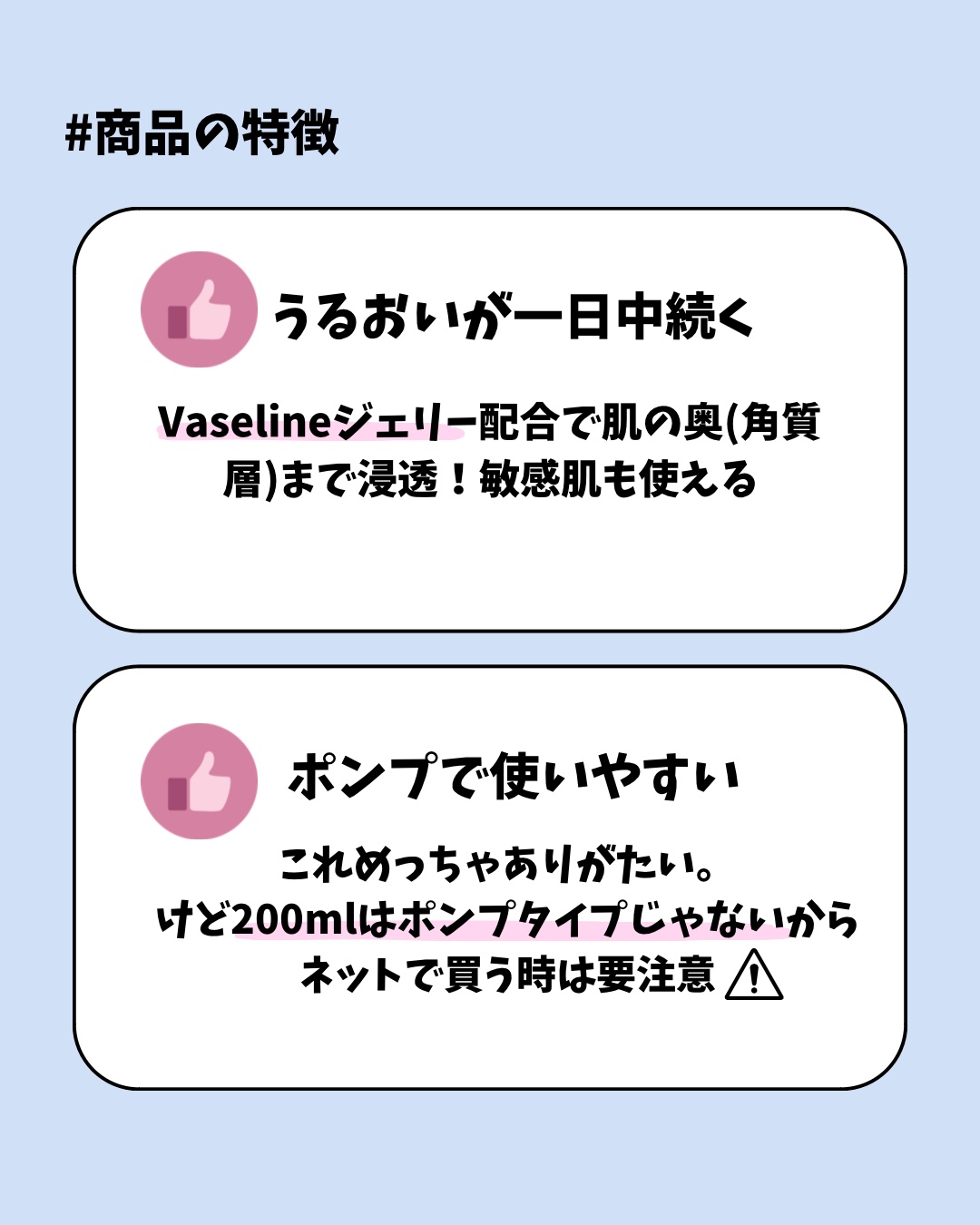 - うるおいたっぷりなのにベタつかない使い心地で、普通肌から乾燥肌、敏感肌の方の肌のうるおいを守ります。 Vaseline®ジェリー*配合 140年間守り続けてきたうるおい成分が肌の奥(角質層)まで浸透。 うるおった肌が一日中続きます。敏感肌の方にもお使いいただけます。 *ワセリン:うるおい成分 用途にあわせた2つのサイズ 200ml : 2014年の発売以来、大好評 400ml : お得な大容量サイズ。ポンプタイプで使いやすい