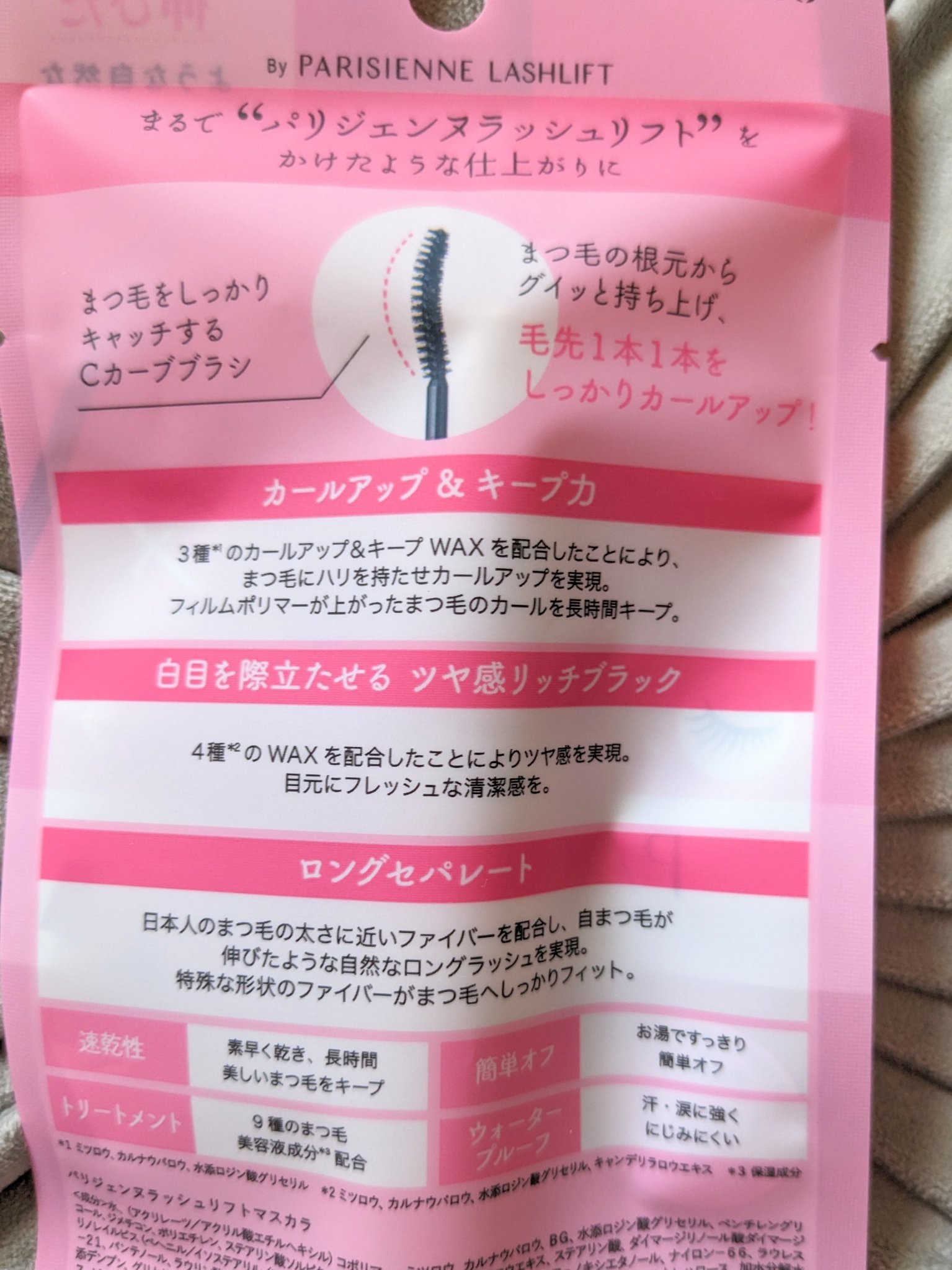 - まつ毛を根元から立ち上げ、一本一本しっかりカールアップ。 艶やかな漆黒ブラックが、瞳のフレームを際立たせ、凛とした強さを宿したナチュラルで品のある眼差しに。 まるで ‷パリジェンヌラッシュリフトをかけたかのような仕上がり‴ を塗るパリジェンヌのマスカラで叶えます。 "塗るパリジェンヌ" 【POINT1】感動*カールアップ&キープ力 カール&キープWAXがまつ毛にハリを持たせてグッと立ち上げ、フィルムポリマーが被膜を形成し上向きカールをキープ。羽根のように軽いハート型ファイバーでまつ毛が下がらず、上向きカールを長時間キープ。 *メイクアップ効果による印象 【POINT2】ロングセパレートな仕上がり 日本人のまつ毛の太さに近い2種類のファイバーと、オリジナルハート型ファイバーを黄金比率でブレンド。独自のハート型の形状がまつ毛一本一本に絡みつきしっかりフィット。自まつ毛のような自然で美しい長さが叶う。 【POINT3】漆黒の艶まつ毛 4種のワックス*成分「ラッシュグロウコンプレックス」を配合し、濡れたような艶と品のあるブラックカラーを実現。透明感をプラスして、品のある目元に。 *ミツロウ、カルナウバロウ、水添ロジン酸グリセリル、キャンデリラロウエキス 【POINT4】Cカーブブラシ 根元からまつ毛を抱え込むように塗ることができる細身のCカーブブラシを採用。まつ毛を根元から立ち上げ一本一本しっかりカールアップします。 ・速乾性:素早く乾き、カールロック。上向きまつ毛を長時間キープ。 ・簡単オフ:自まつ毛にも優しいフィルムタイプで、お湯で簡単オフ。 ・ウォータープル―フ:水、汗、涙に強くにじみにくい。 ・トリートメント:9種のまつ毛美溶液*成分配合。*保湿成分